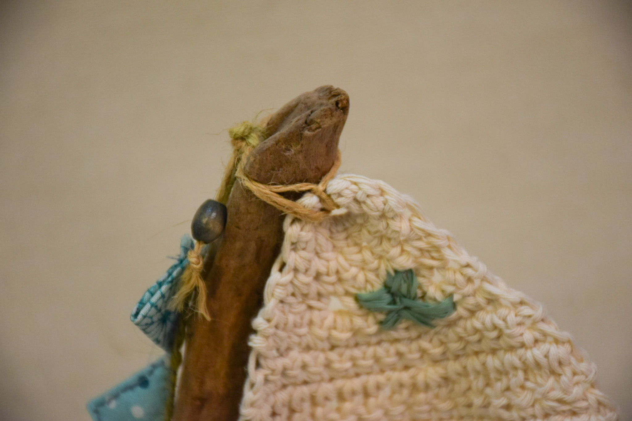 Barco madera deriva, vela crochet, materiales reciclados,barnizado,mide 20 cms de largo, 19 cms de altura.