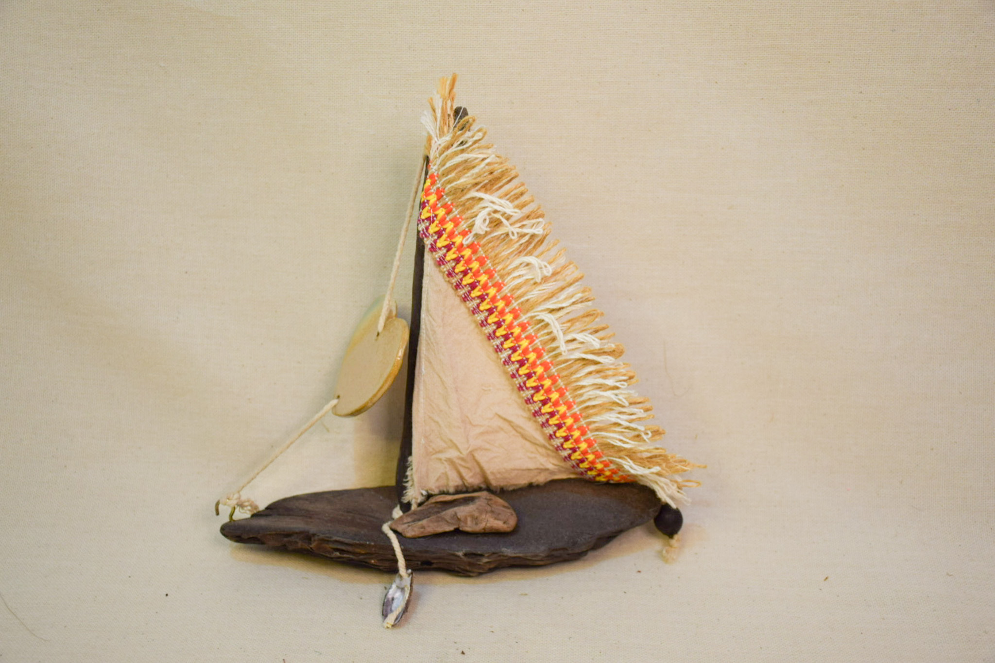 Barco madera deriva, corazon gres,barnizado, mide 26 cms de largo ,25 cms alto.