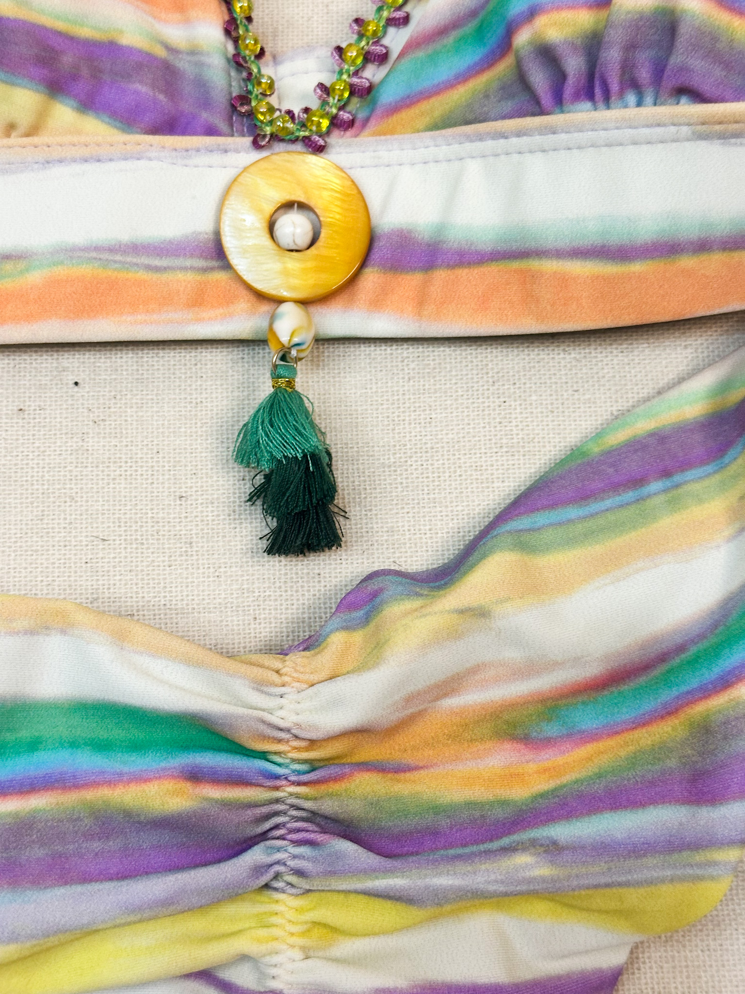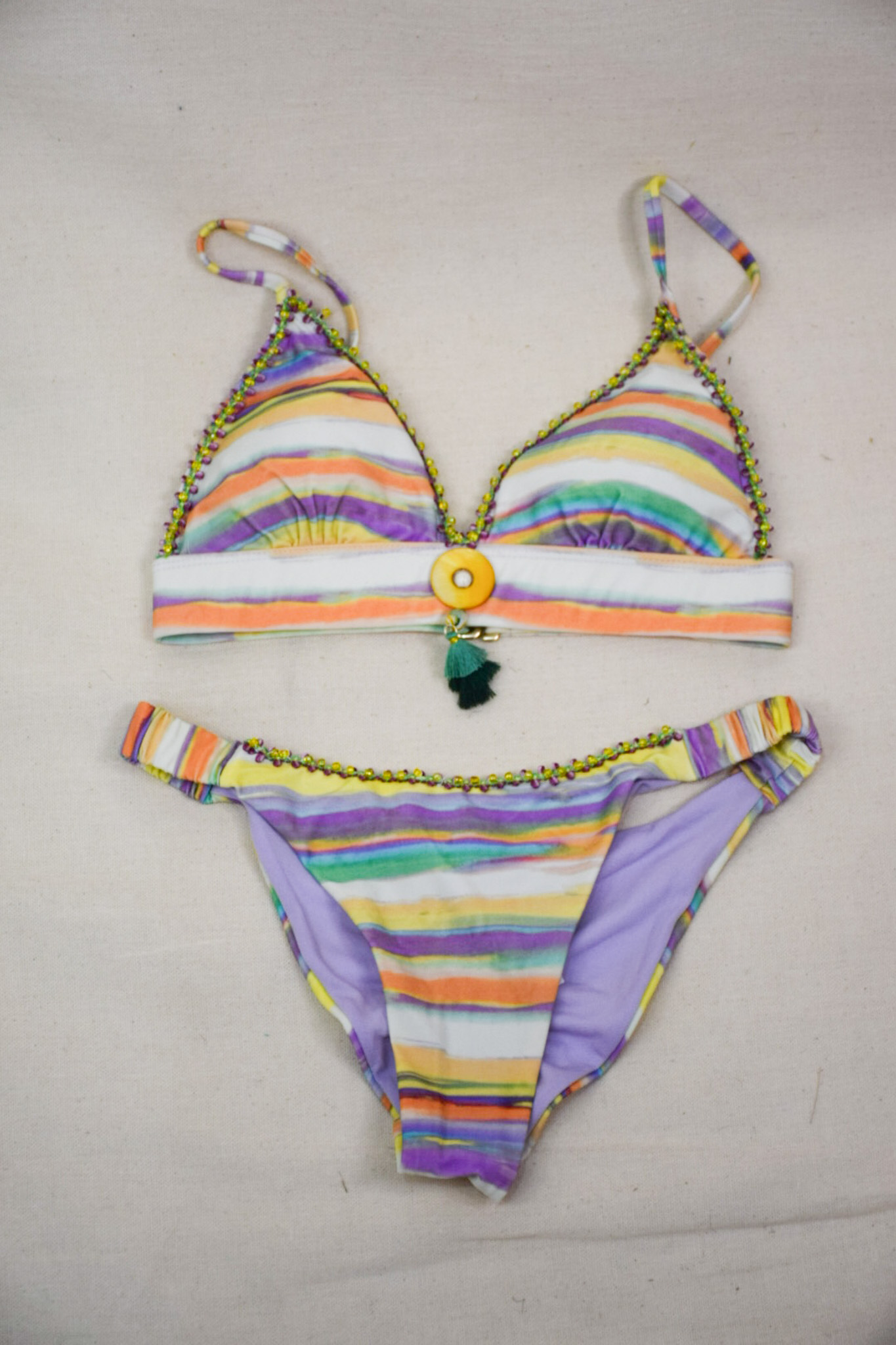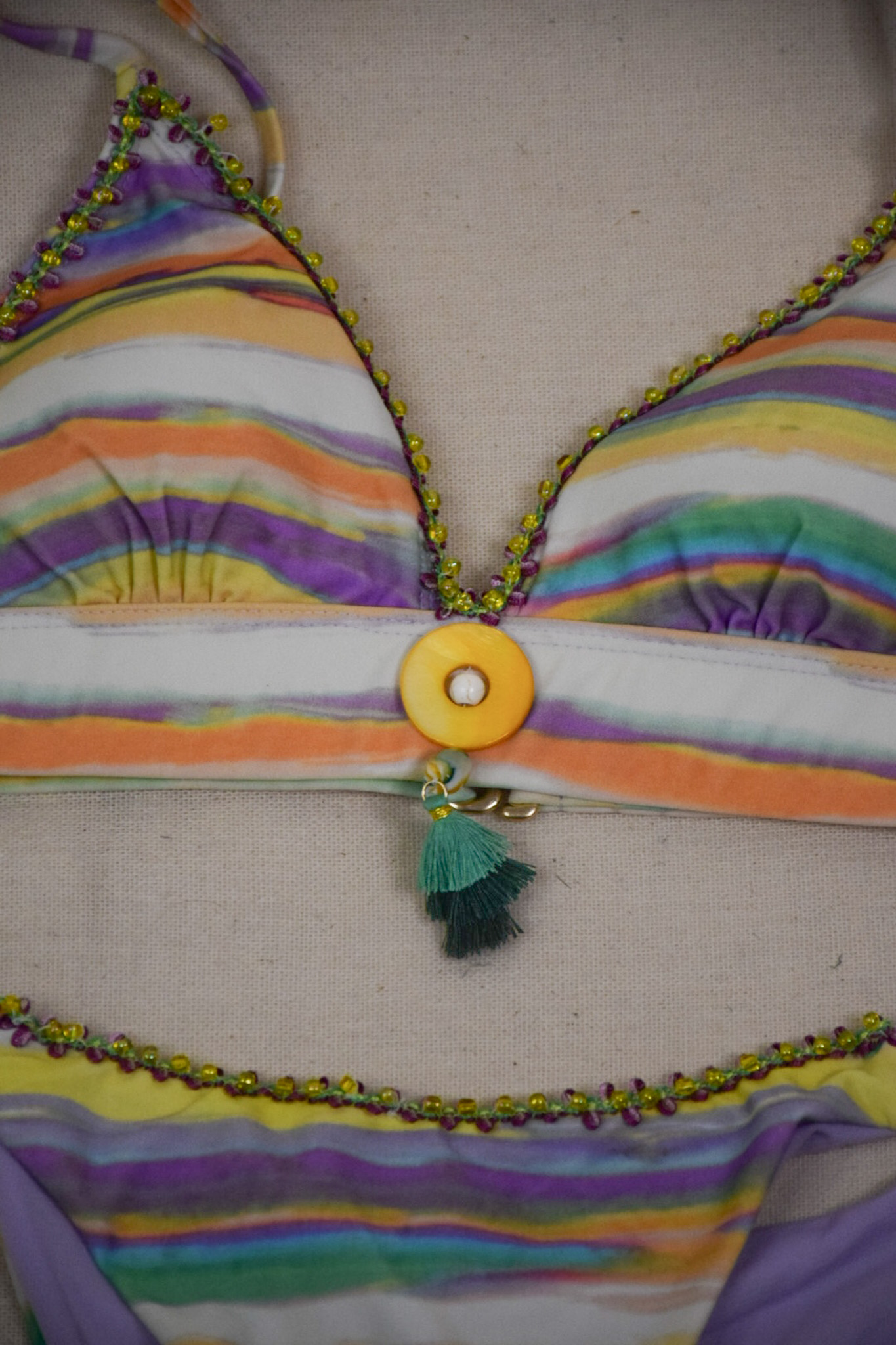 Bikini, nacar amarillo,colores ,decorado a mano, forro,talla XS.