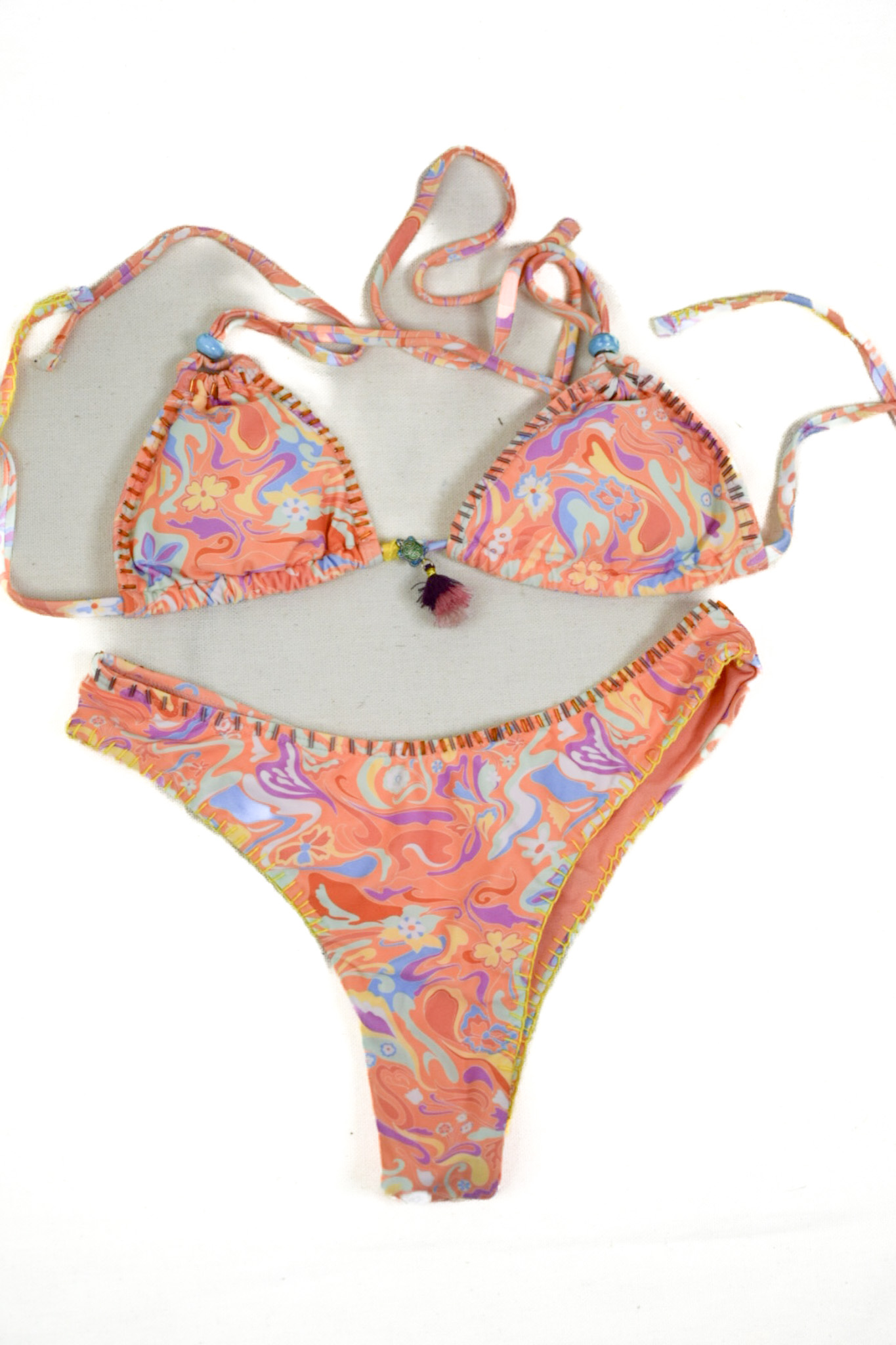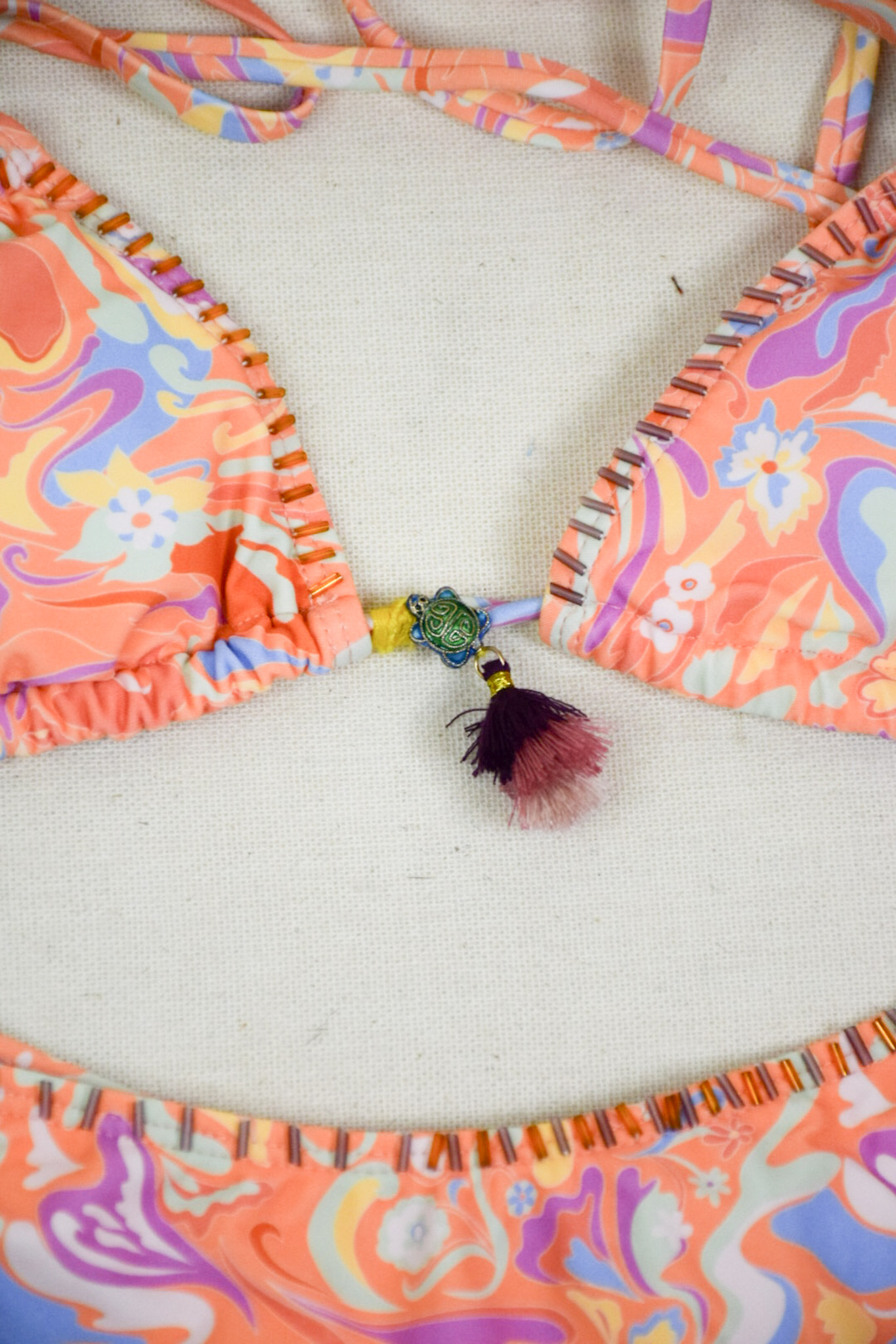 Bikini,triangulo, lycra, forrado, adaptable, deorado amano, unico,talla XS