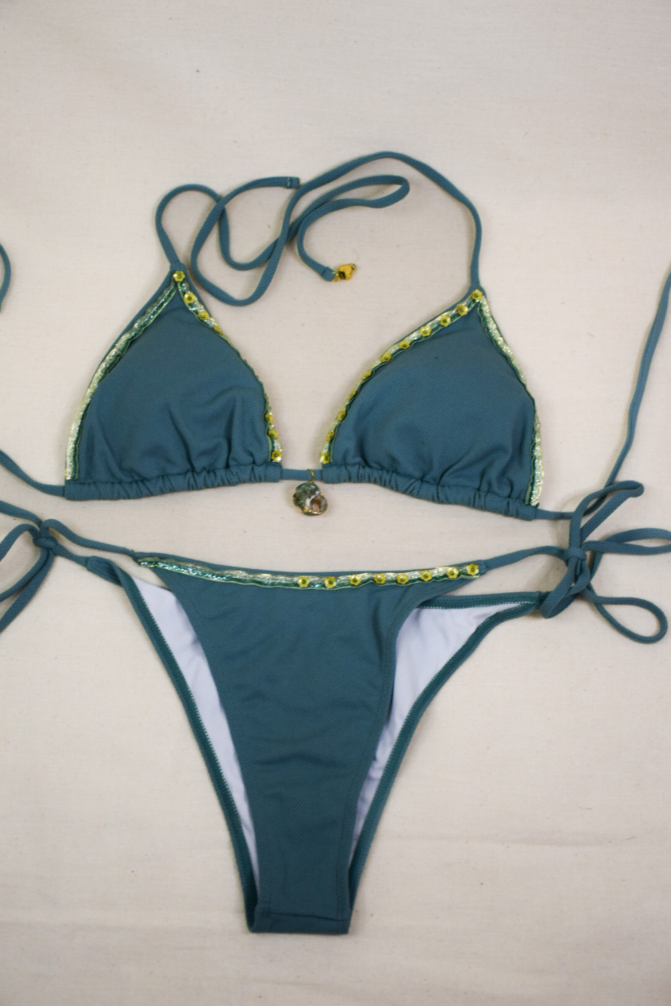 Bikini, triangulo, lycra, turquesa, caracol,forrado, unico, decorado amano, talla L