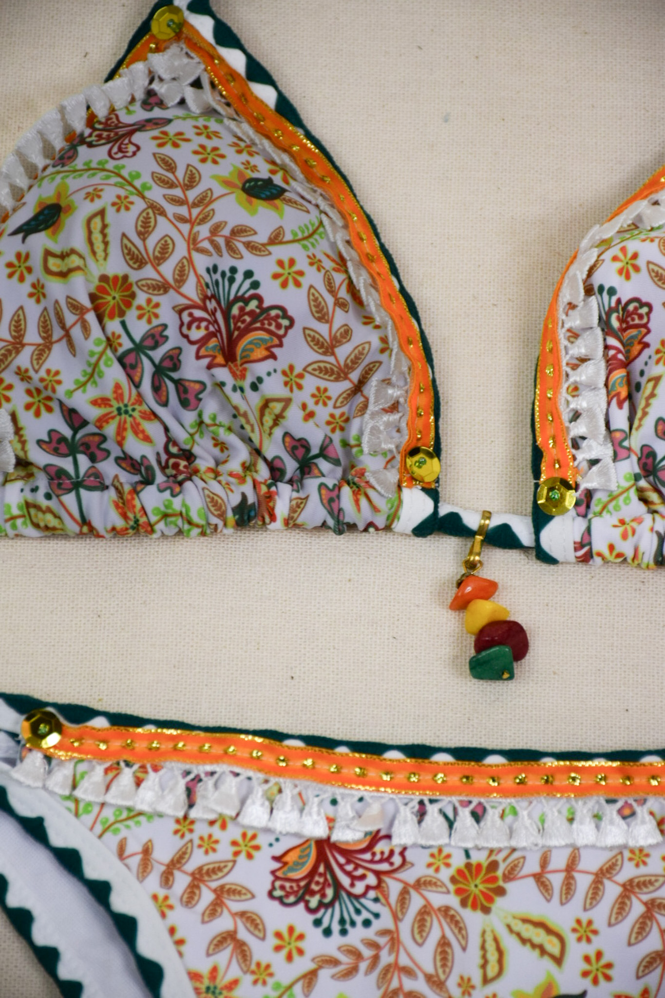 Bikini, floreado, base blaca, forrado, lycra, triangulo, adaptable, decorado amnao, unico, talla L.