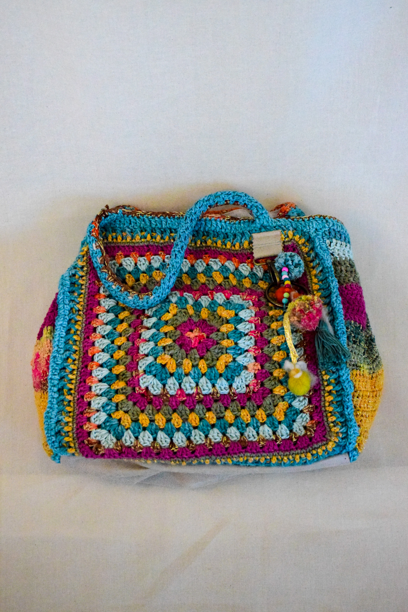 Bolso crochet, algodon, base eco cuero, adorno pompon,bolsillo interior, forro lino, adaptador de tamaño, mide 37 cms alto,38cms ancho, 22cms fuelle.