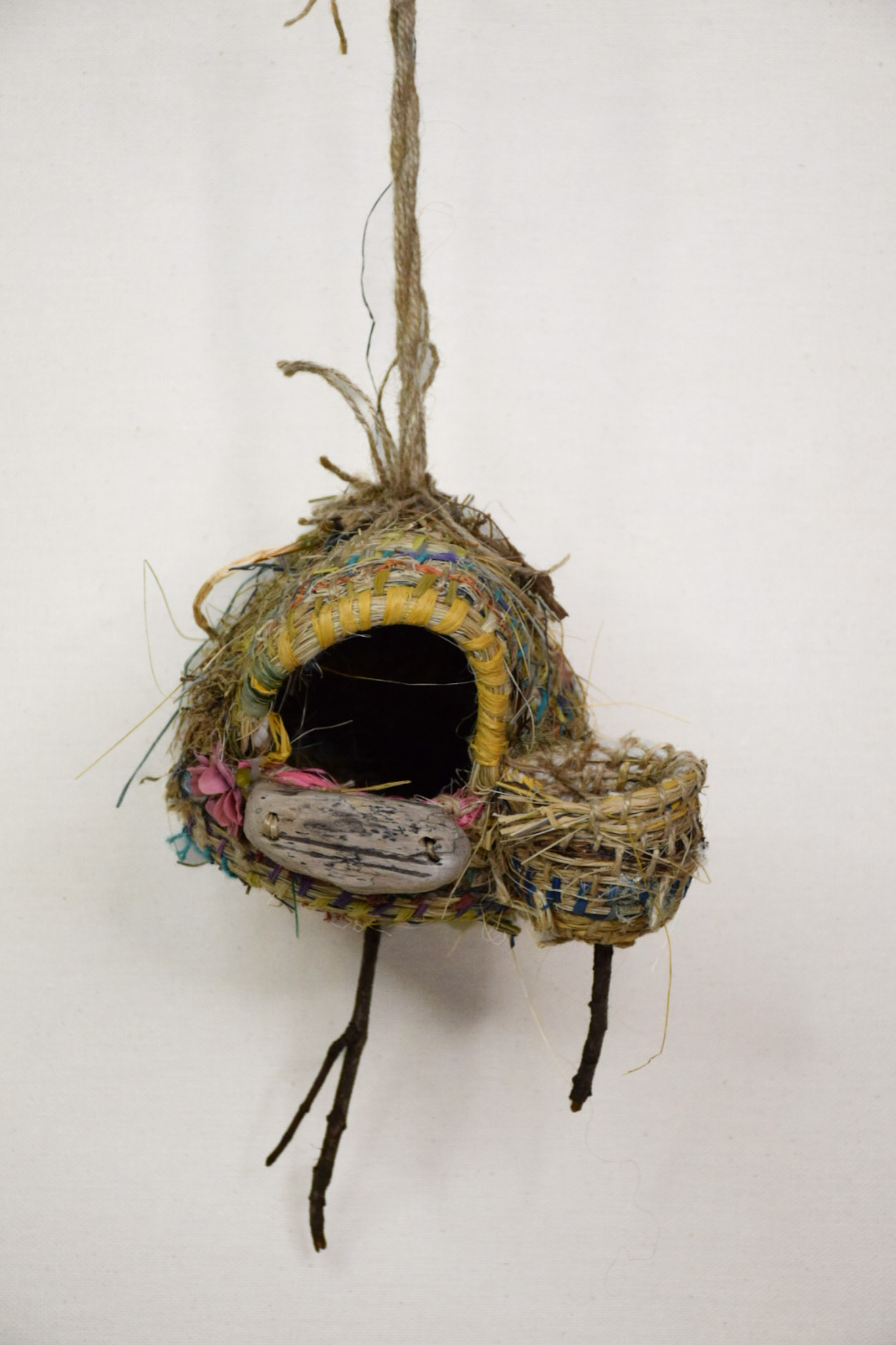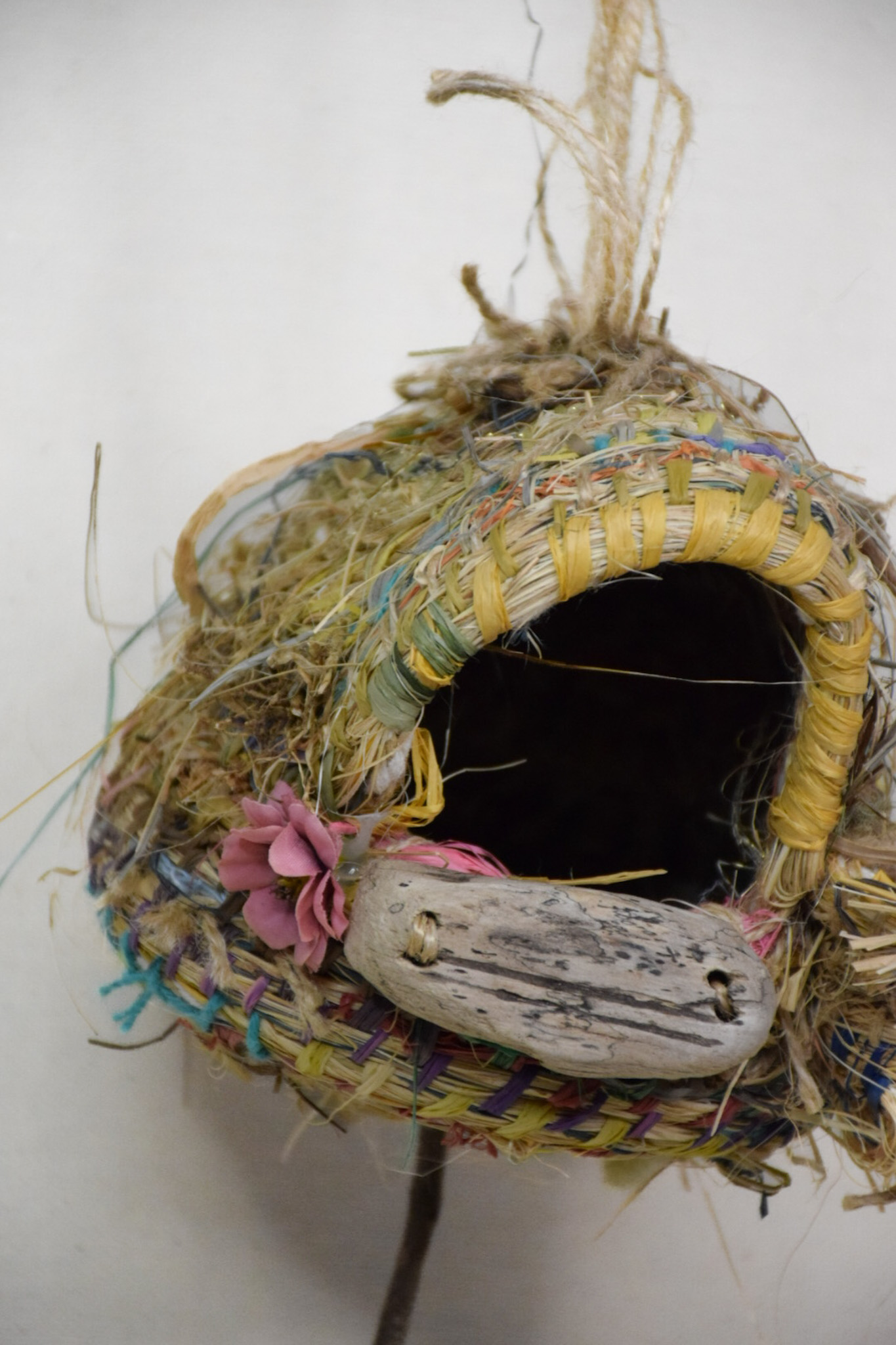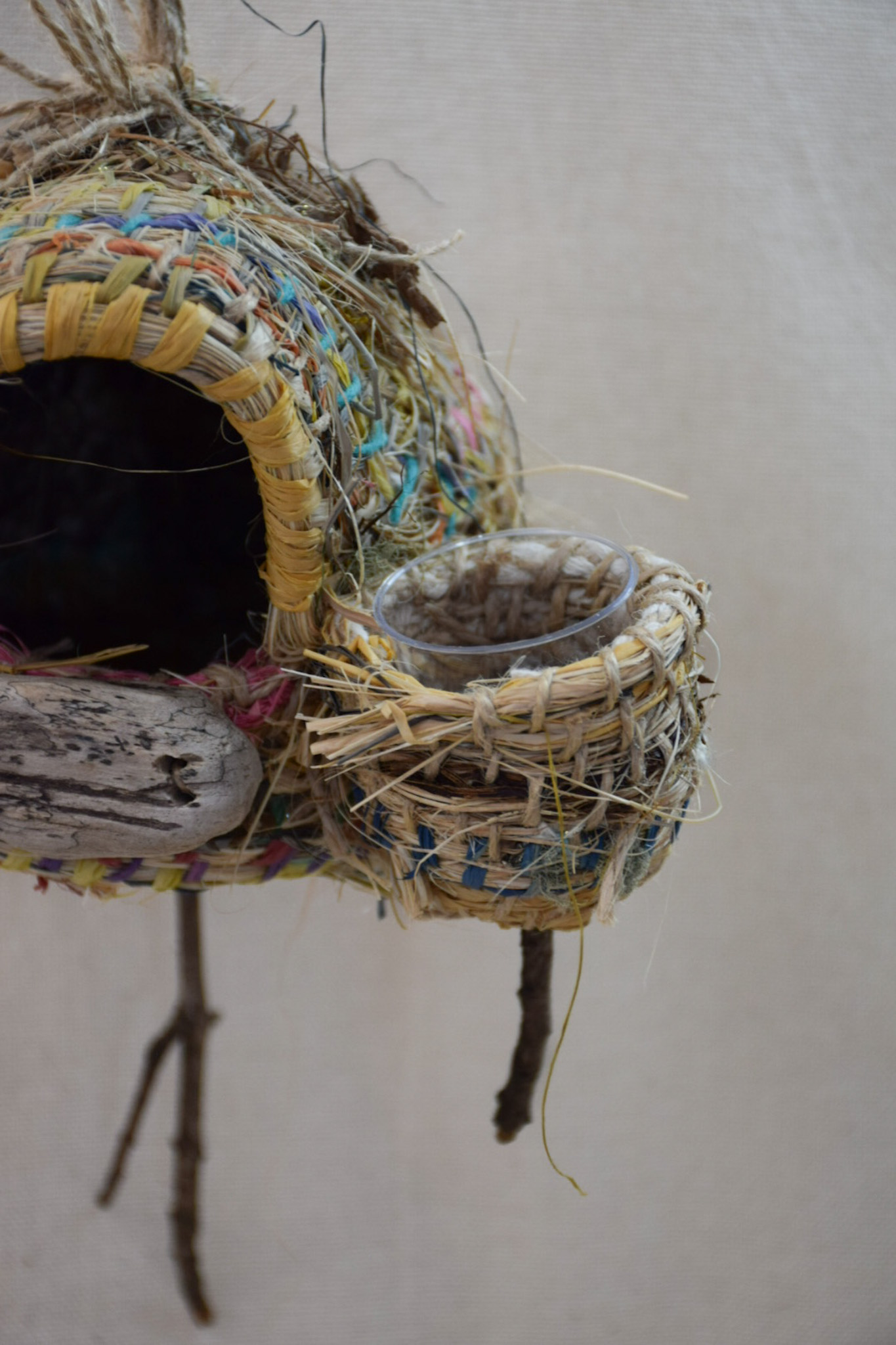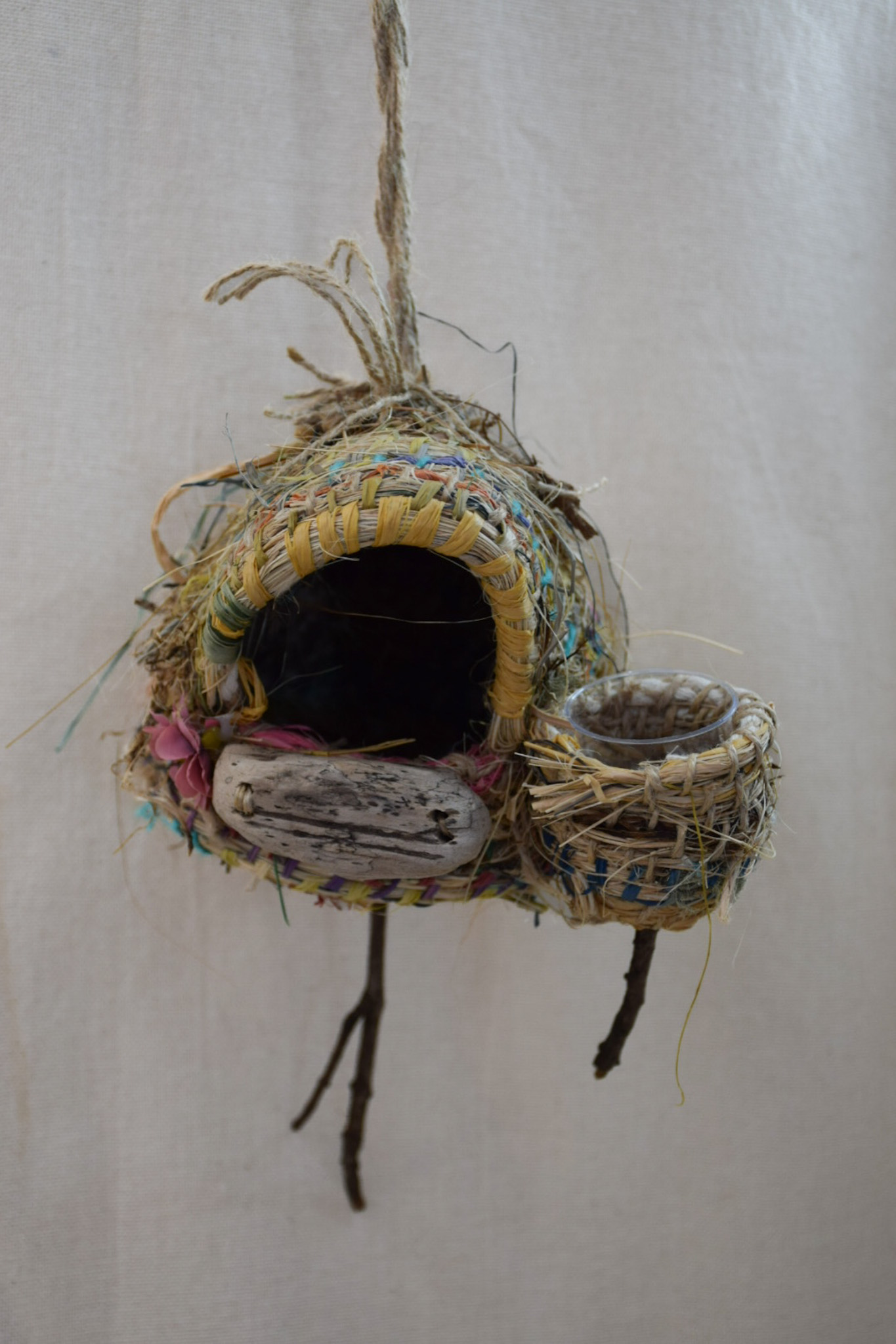 Nido de pajaritos, tecnica libre, colgante, bebedero con vaso platico, impermeabilizada, mide 16 cms diametro, 15 cms altura, rama en la base.