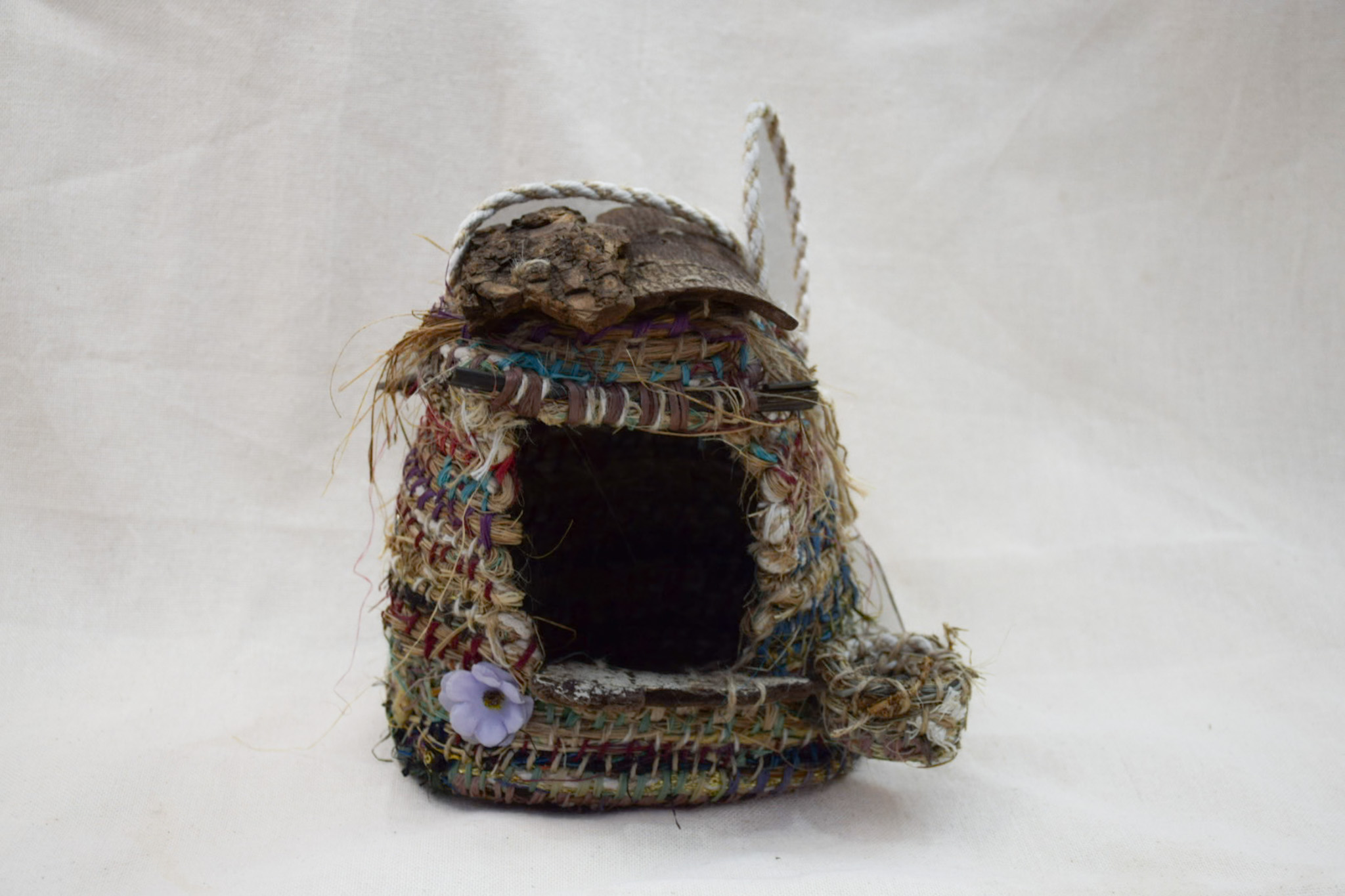 Nido de pajaritos,impermeabilizada, colgante, tecnica libre, techo madera, porta alimento, mide 19 cms altura ,18 cms de diametro.