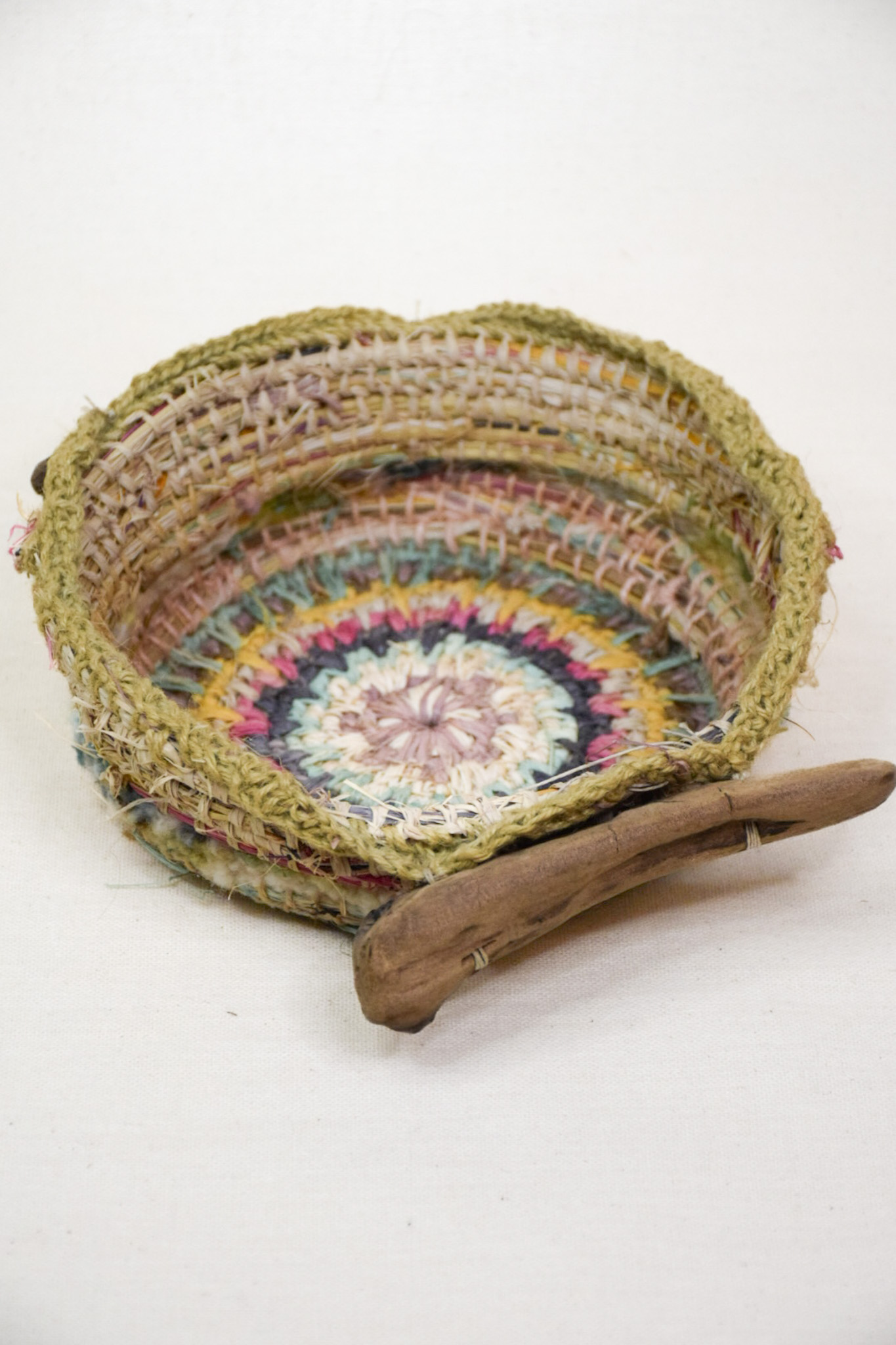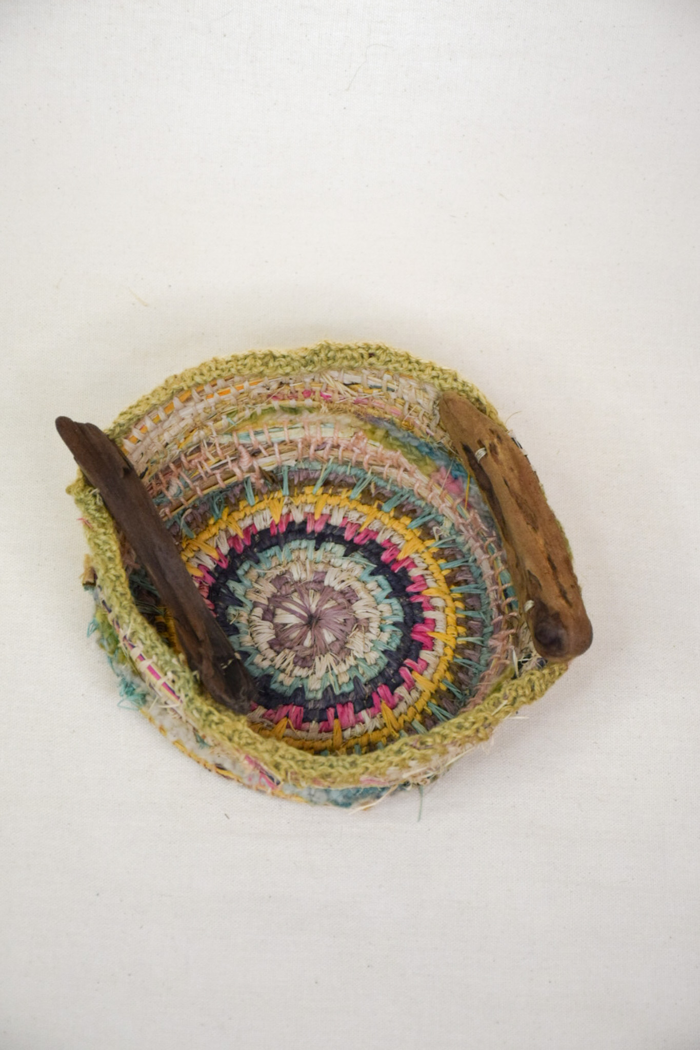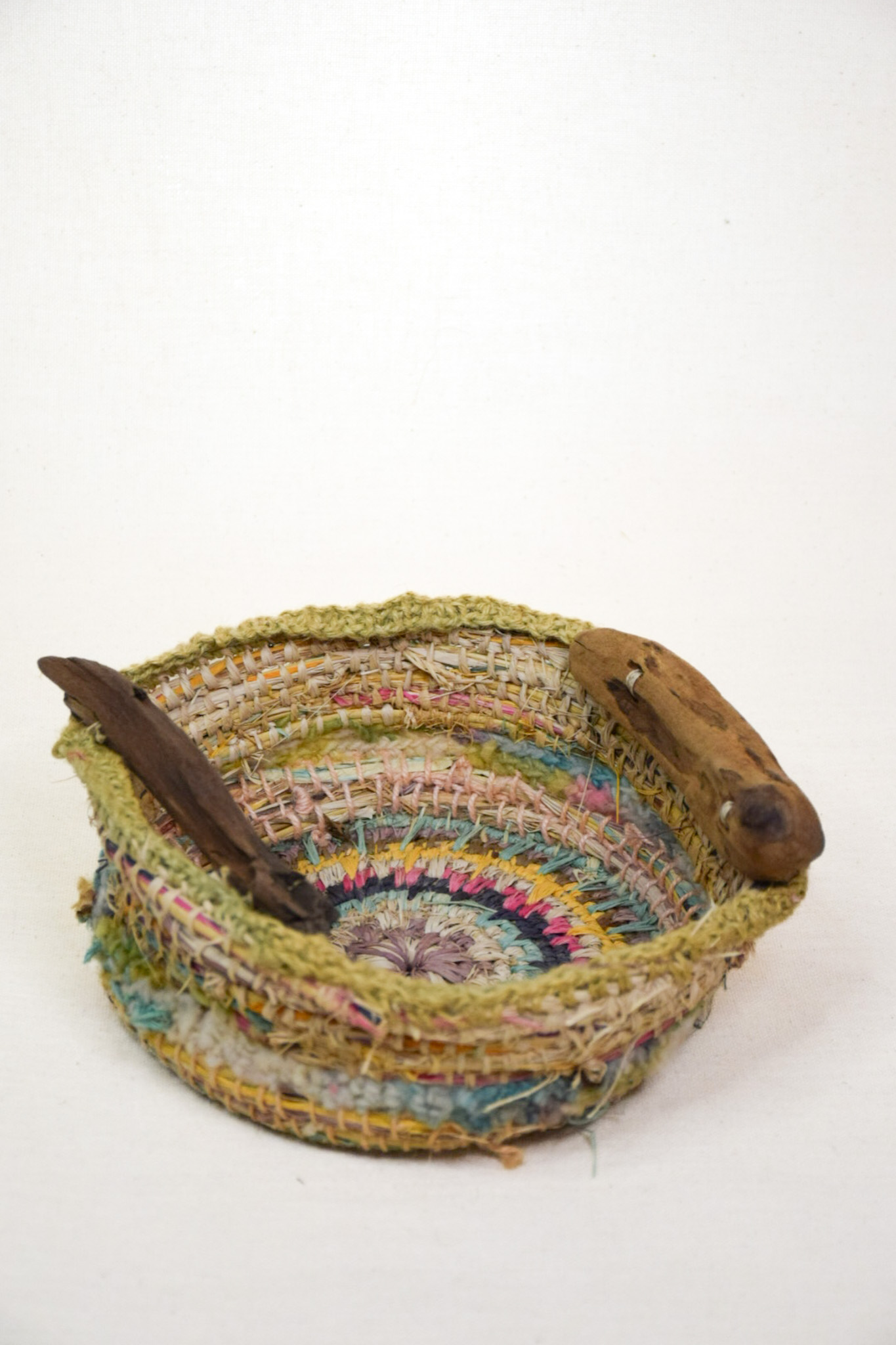 Cesta , tecnica mixta, asas madera,lana, rafia, sisal, ñocha,mide 18 cms diametro base,8 cms altura, impermeabilizada.
