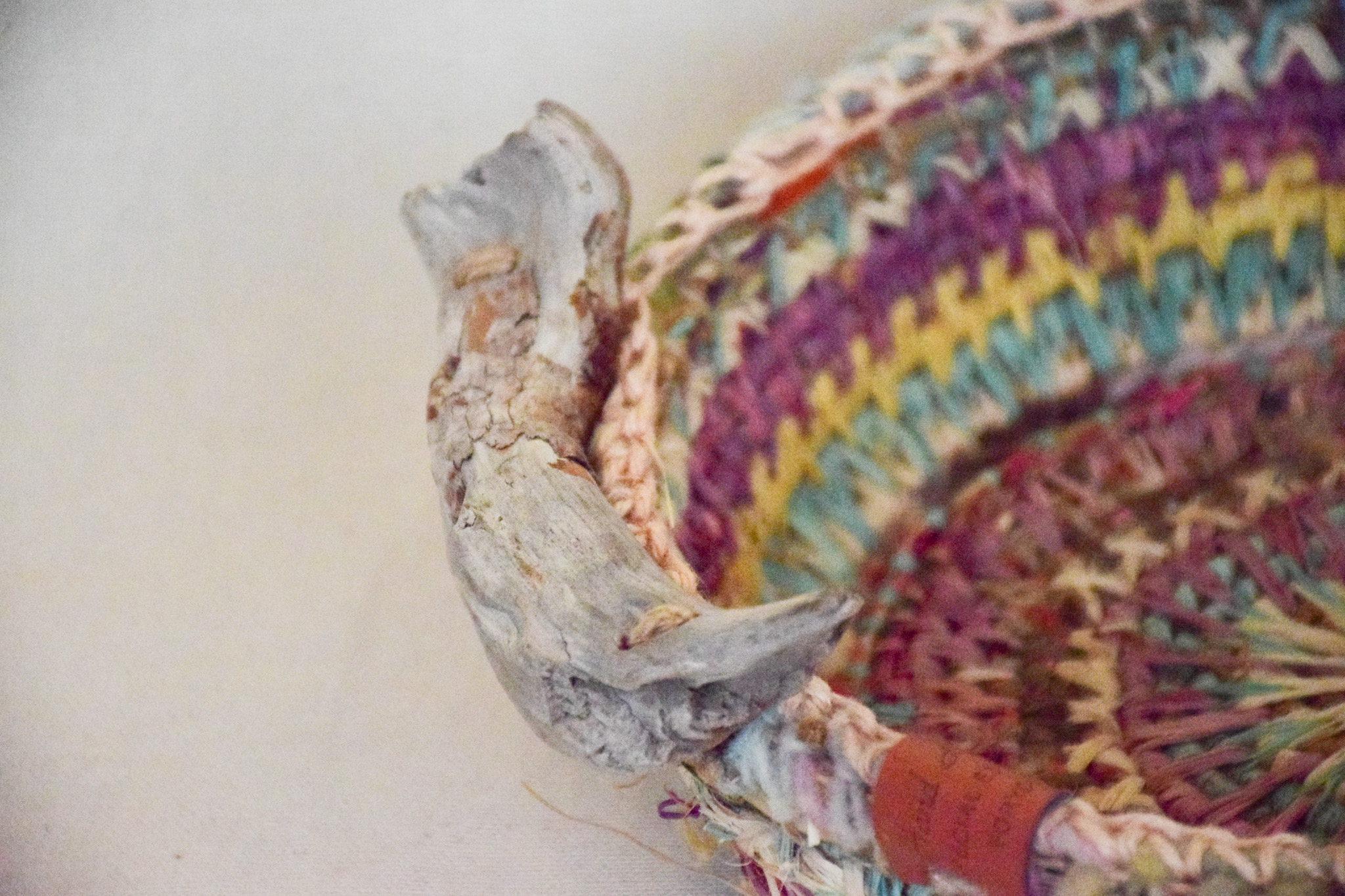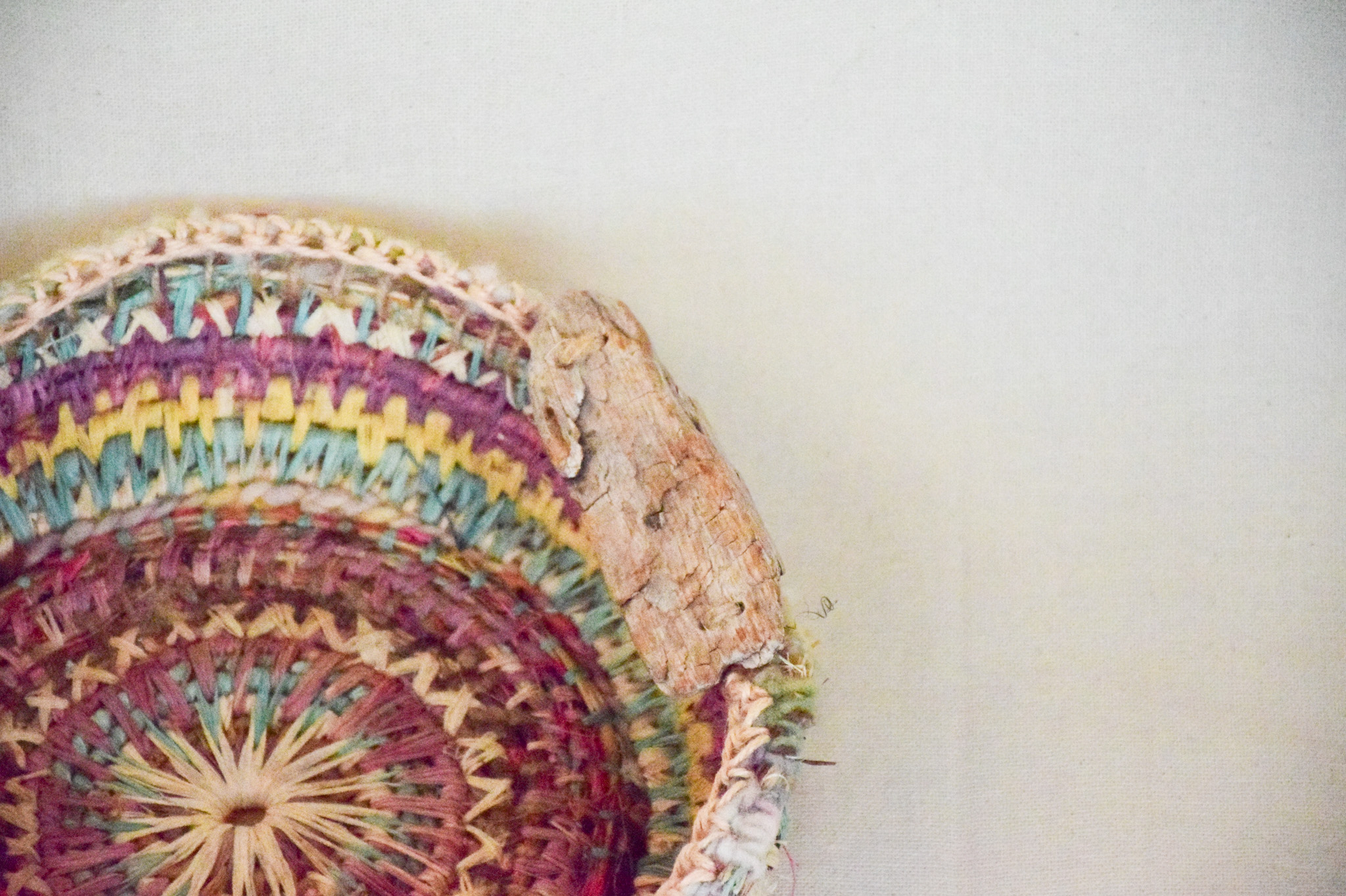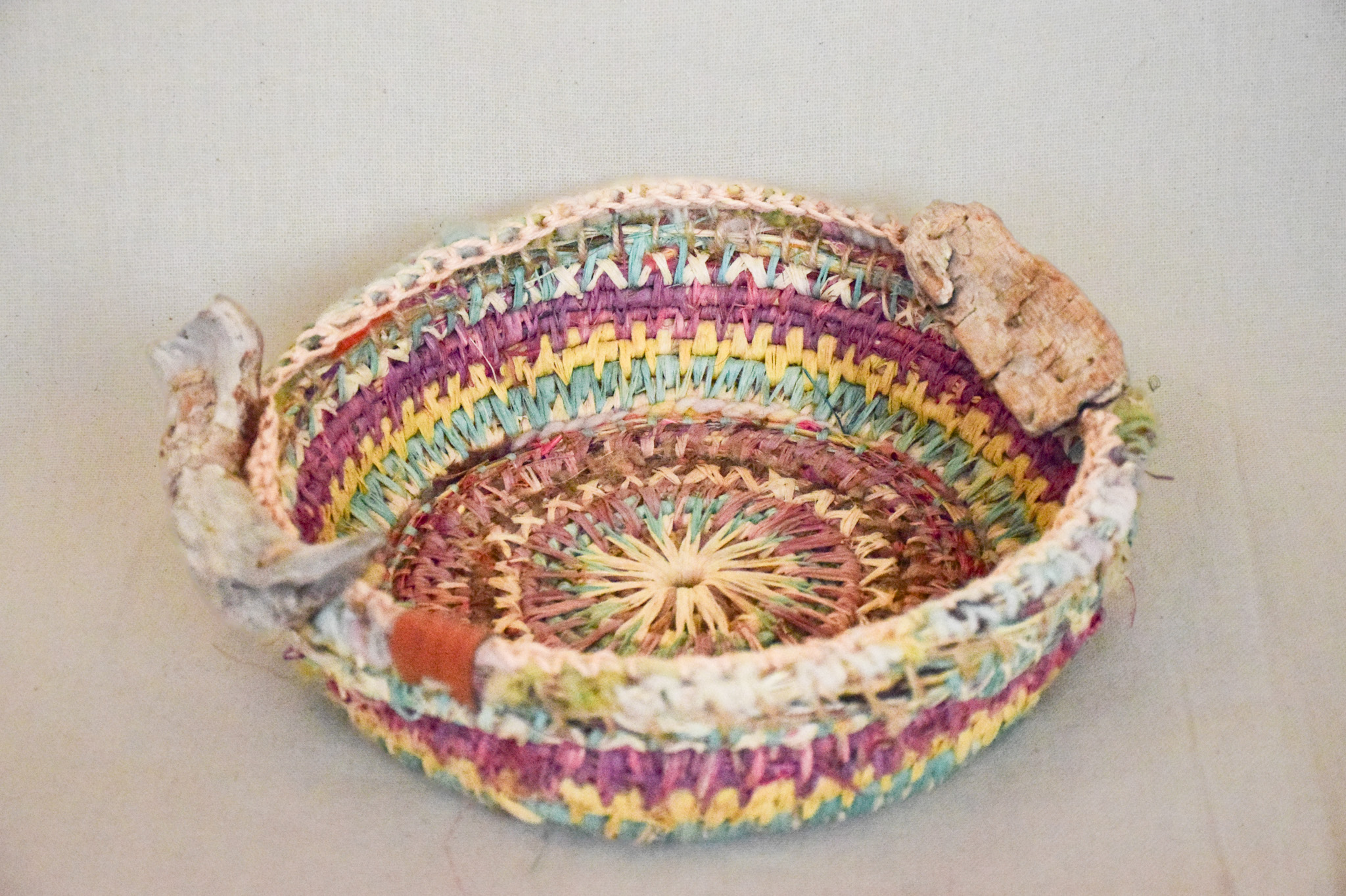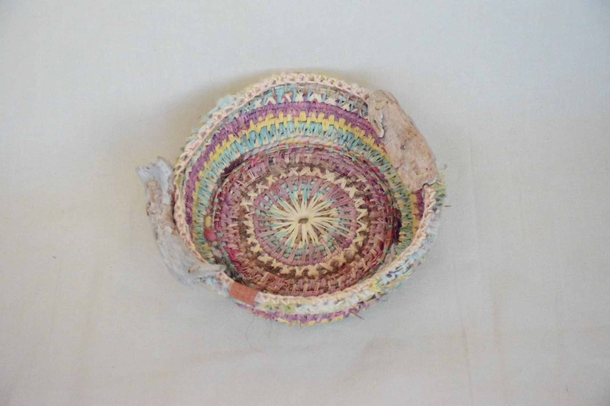 Cesta , colores pasteles, tecnica mixta, asas madera,mide 23cms diametro, 8 cms altura,impermeabilizada.