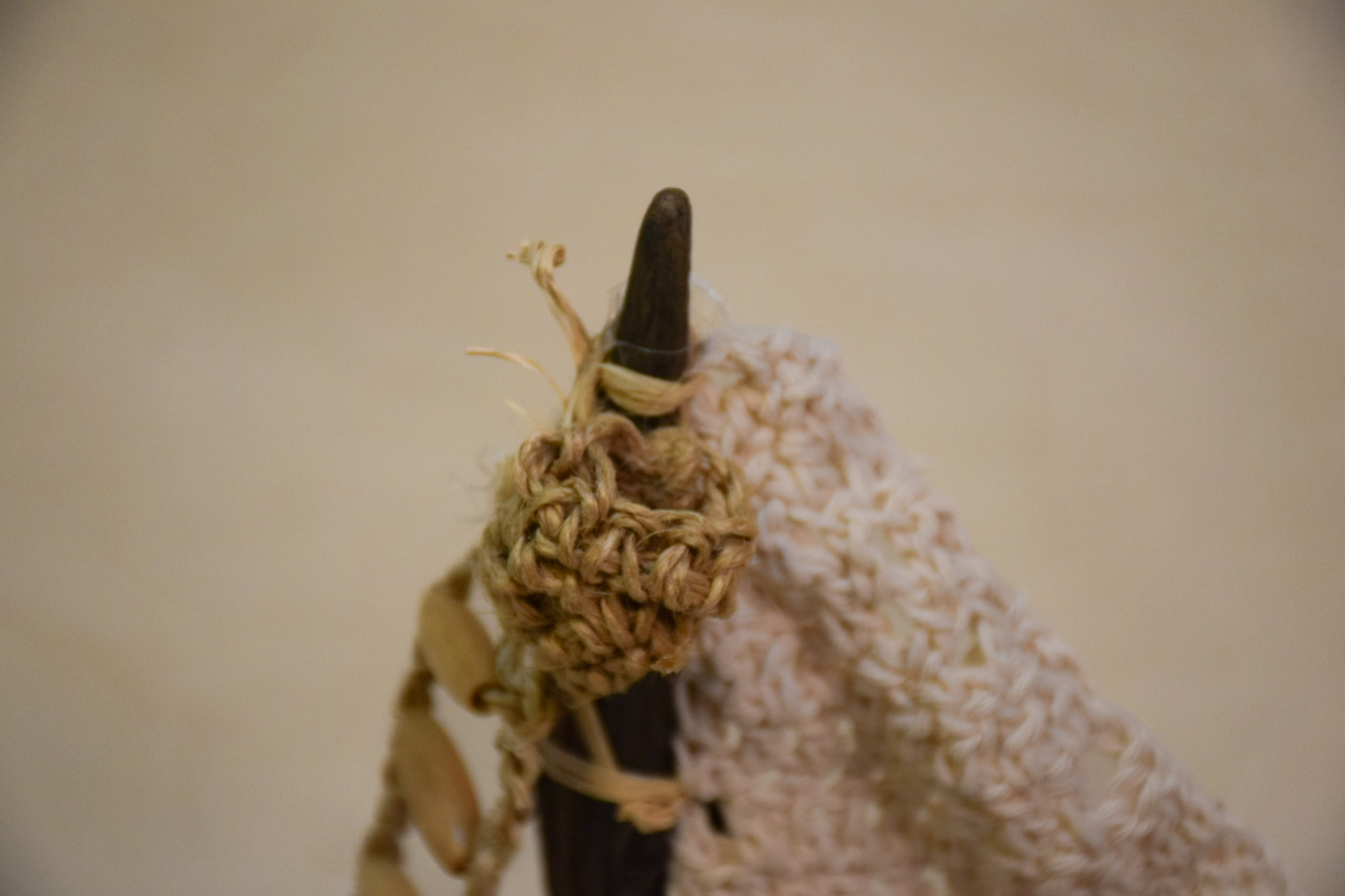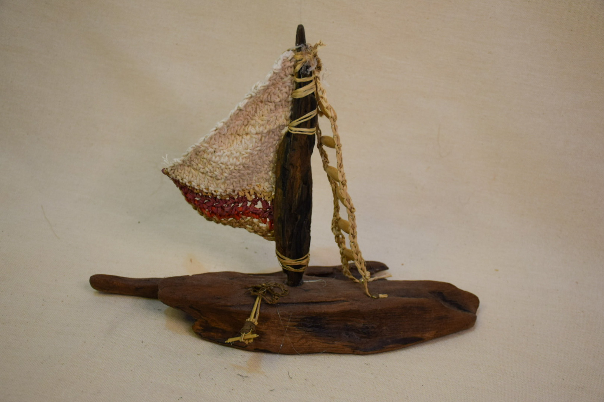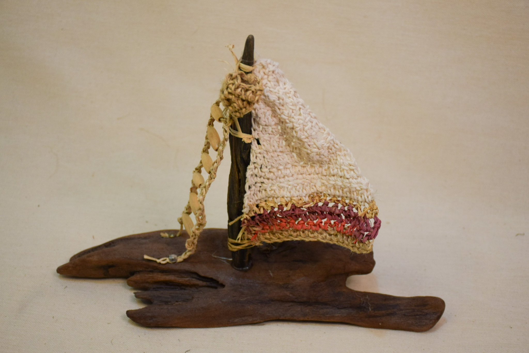 Barco madera deriva, barnizado,vela crochet,decorado materiales reciclados, mide 33 cms de largo, 25 cms de altura.