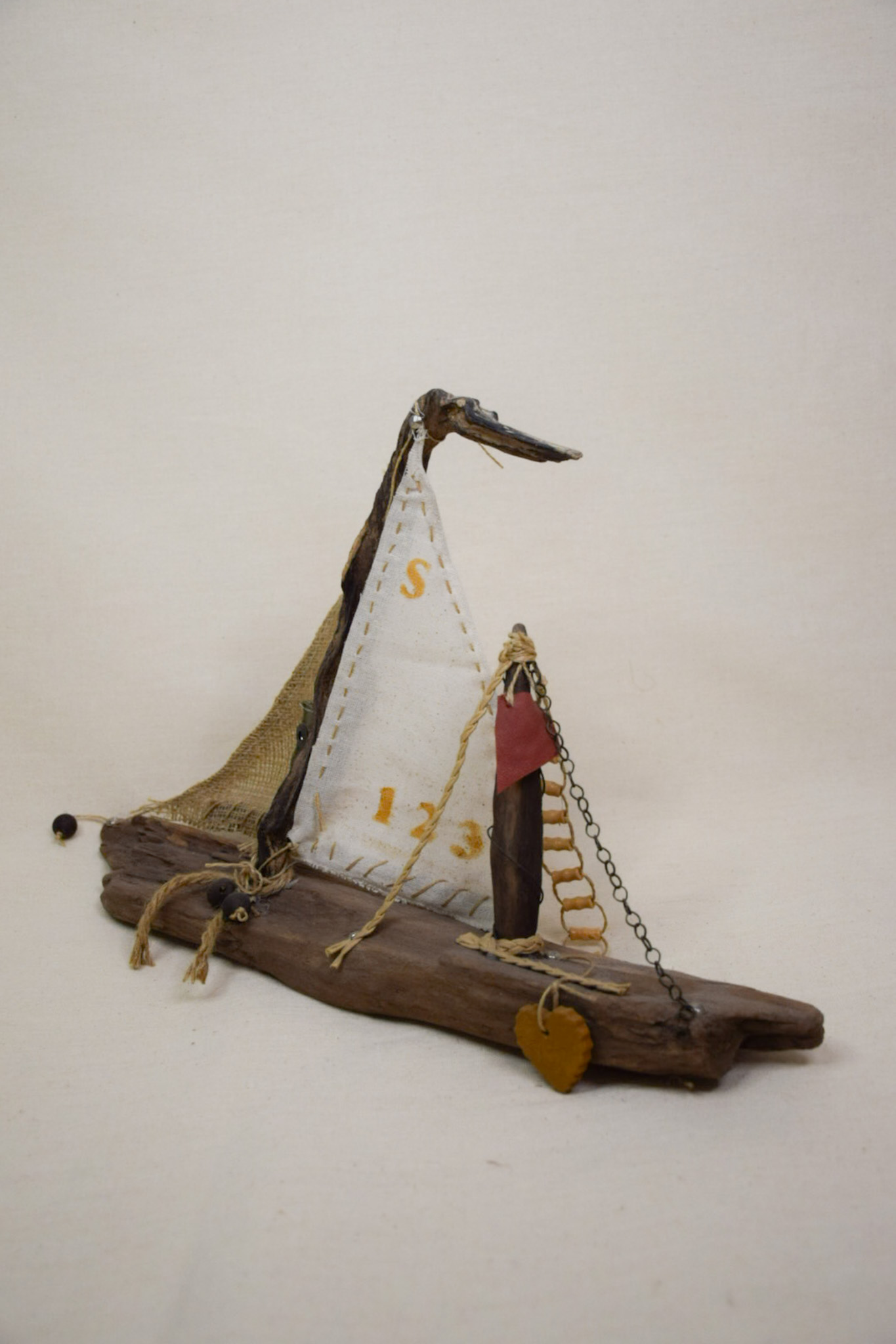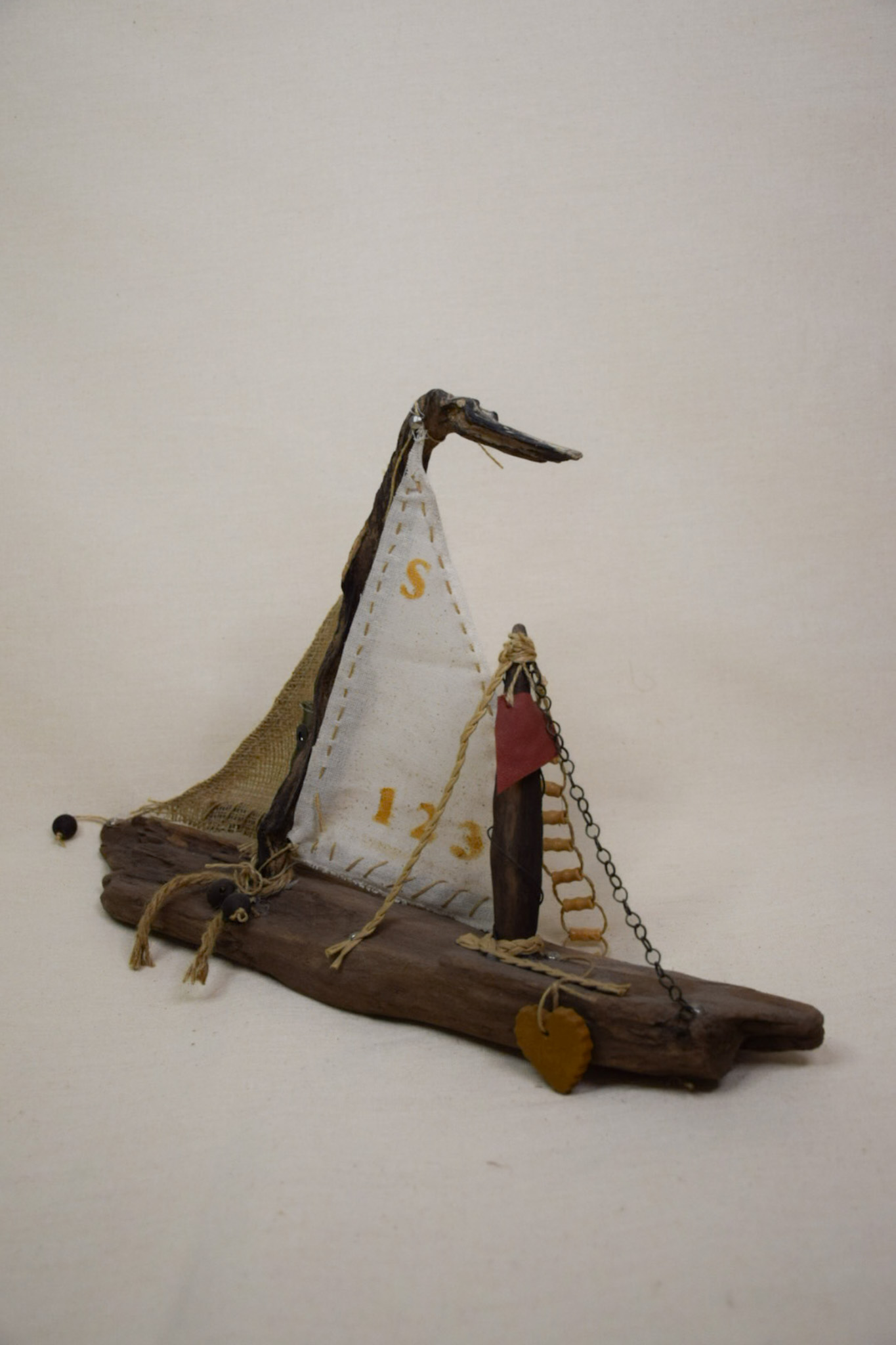 Barco madera deriva, barnizado, materiales reciclados,corazon gres,decoracion, mide 50 cms de largo,30 cms de altura