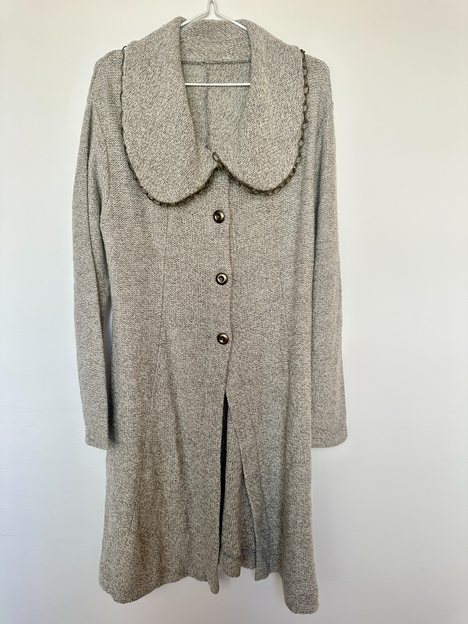 Abrigo, lana,beige,melange, manga larga, botones, decorado a mano,,unico, mide 96 cm de largo, entallado, talla M.