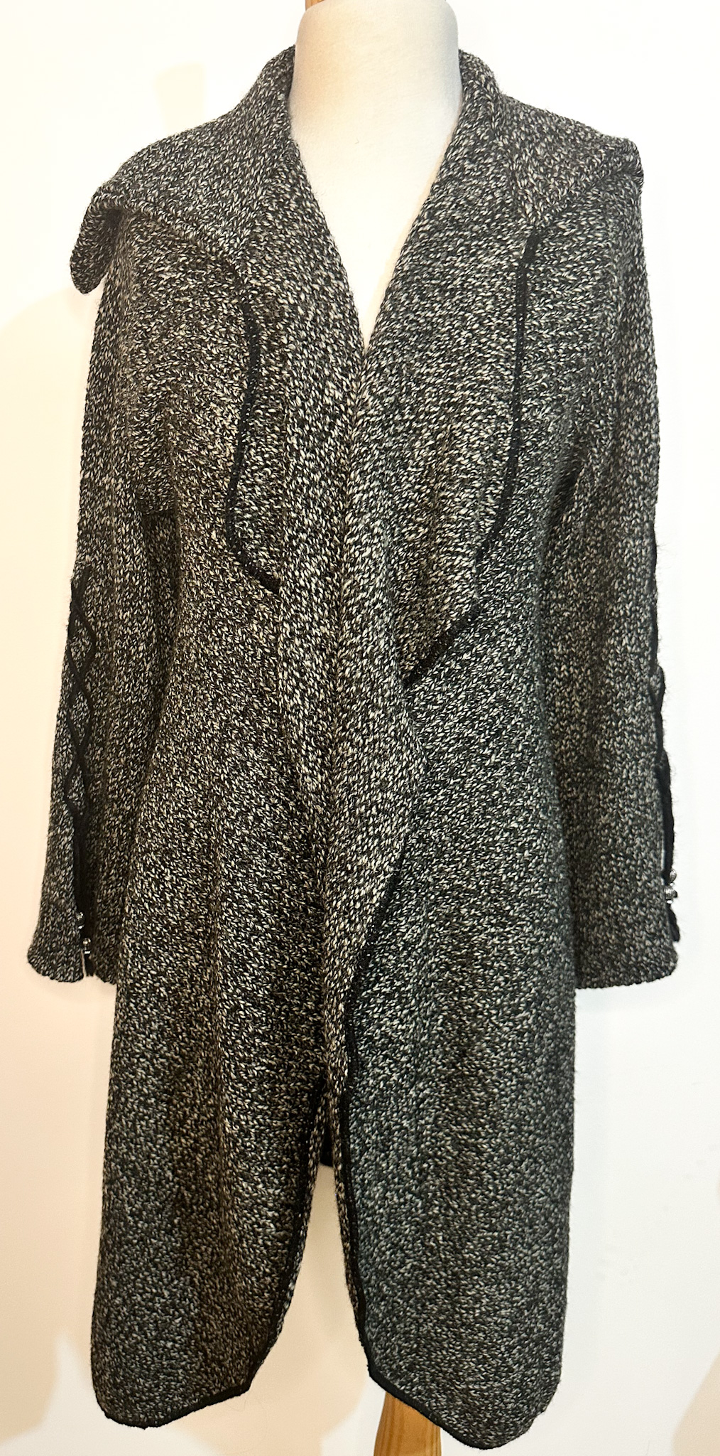 Abrigo, lana, melange, negro, blanco, aplicaciones, decorado a mano, manga larga, mide 1.06 mts largo, talla unica.