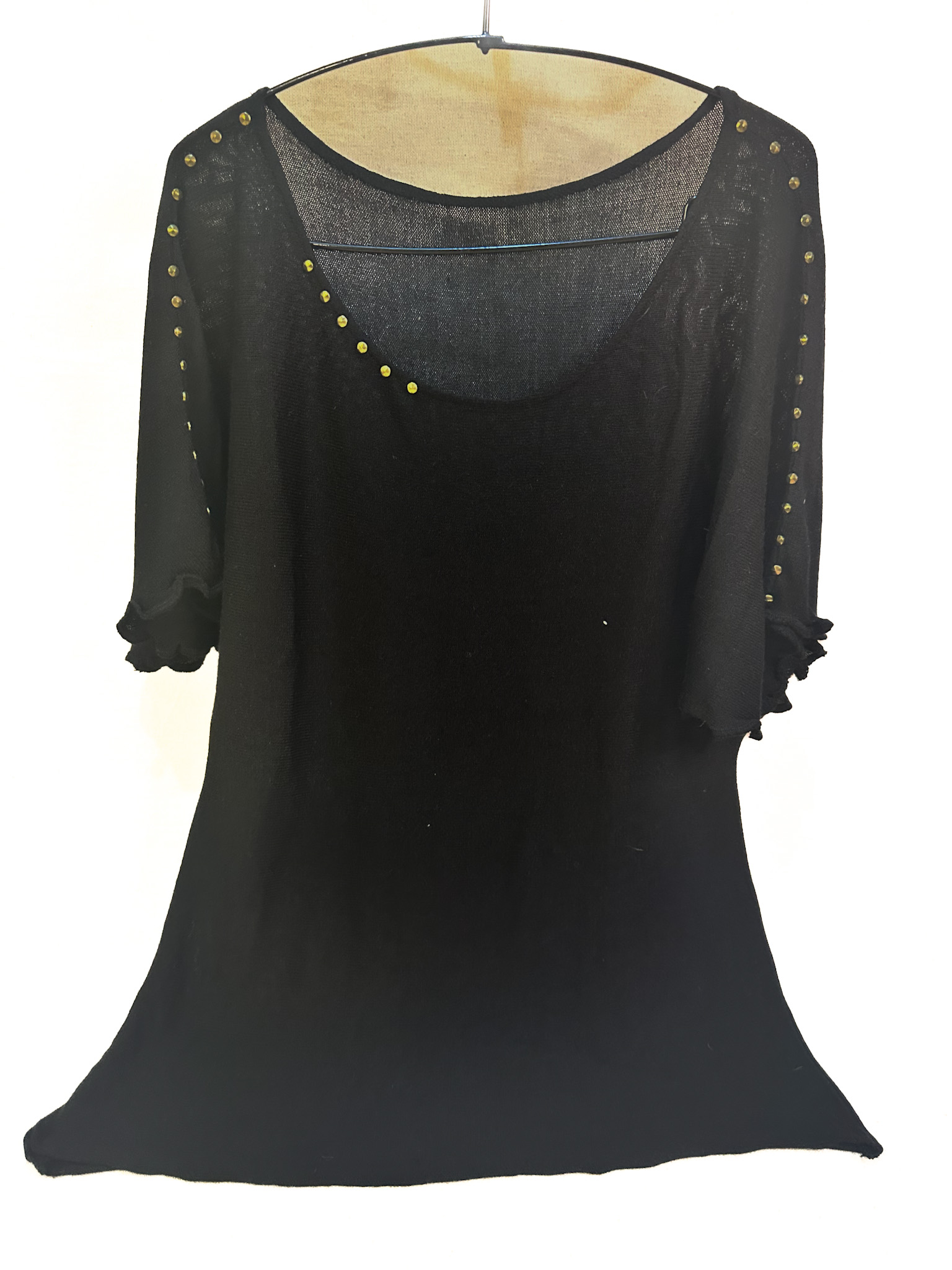 Polera , hilo, algodon, negra,tachas, manga caida, cuello bote, dedcorada a mano, unica, talla unica.