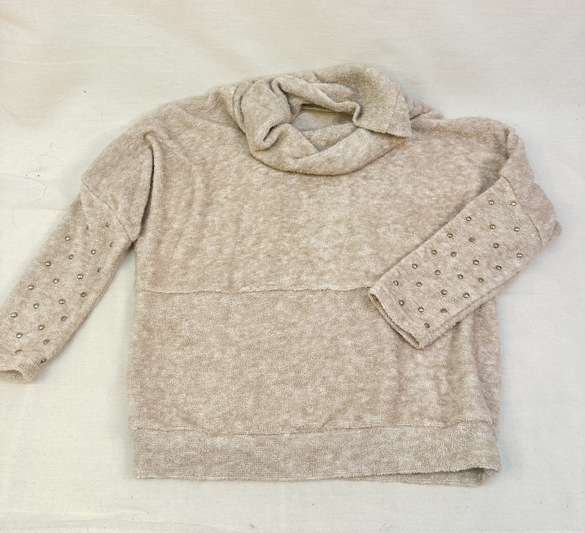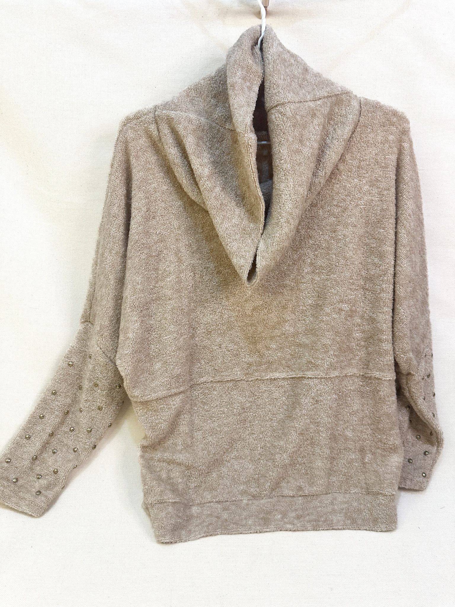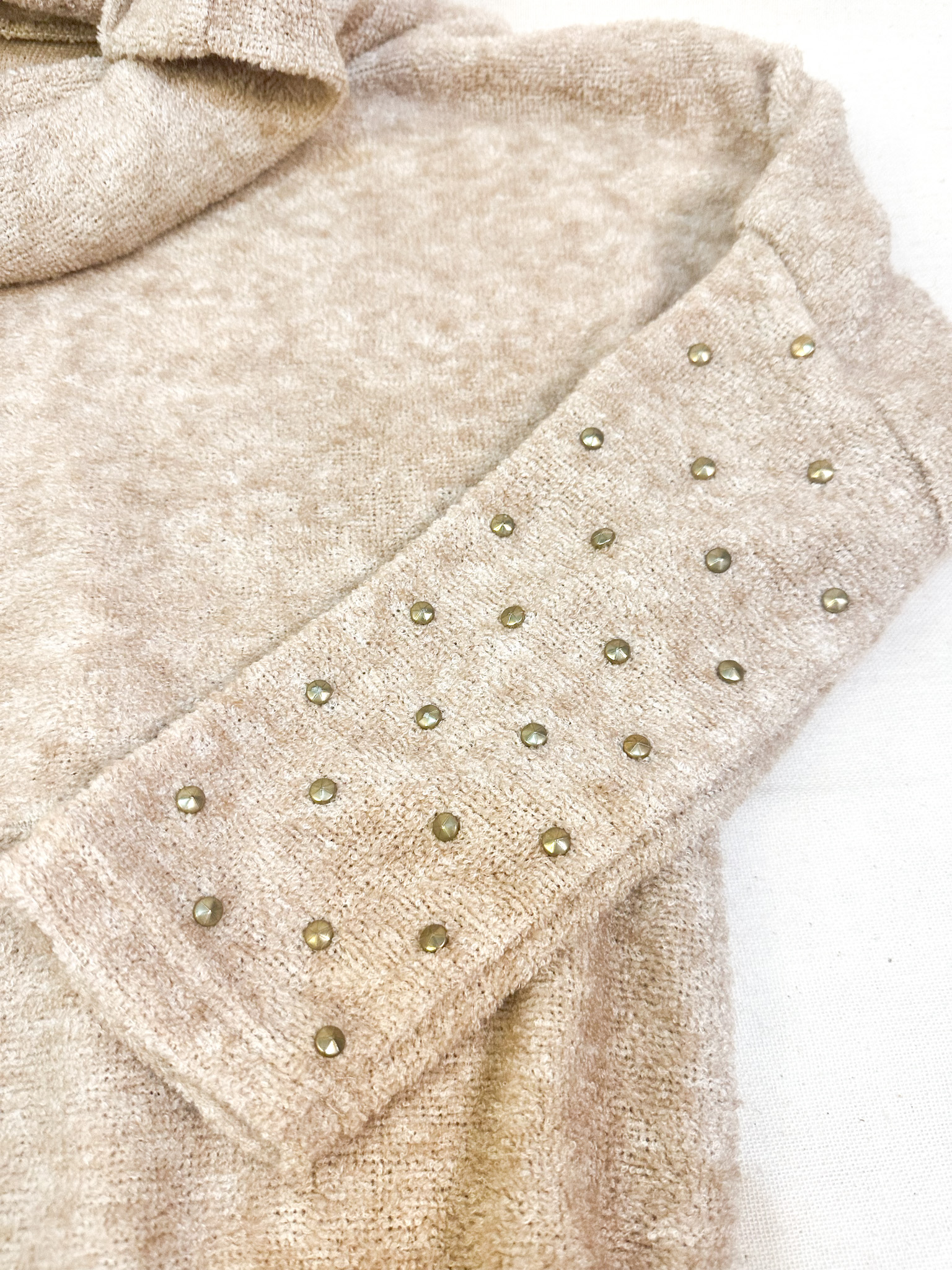 Sweater, toalla, beige, tachas, manga larga,tortuga,bolsillo frontal, decorado a mano, unico, talla unica.