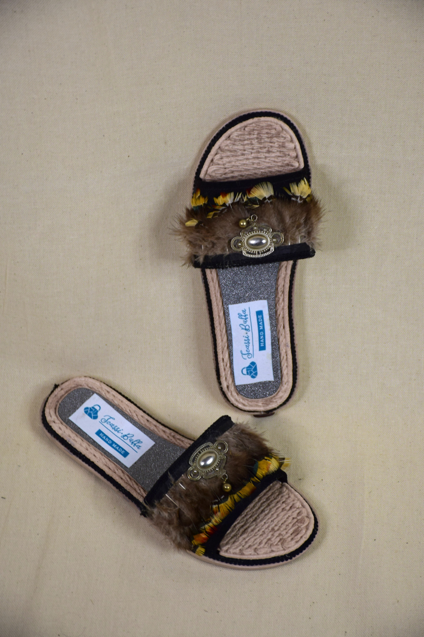 Sandalias, base negra, planta goma,decorada con plumas.Mide 26,5