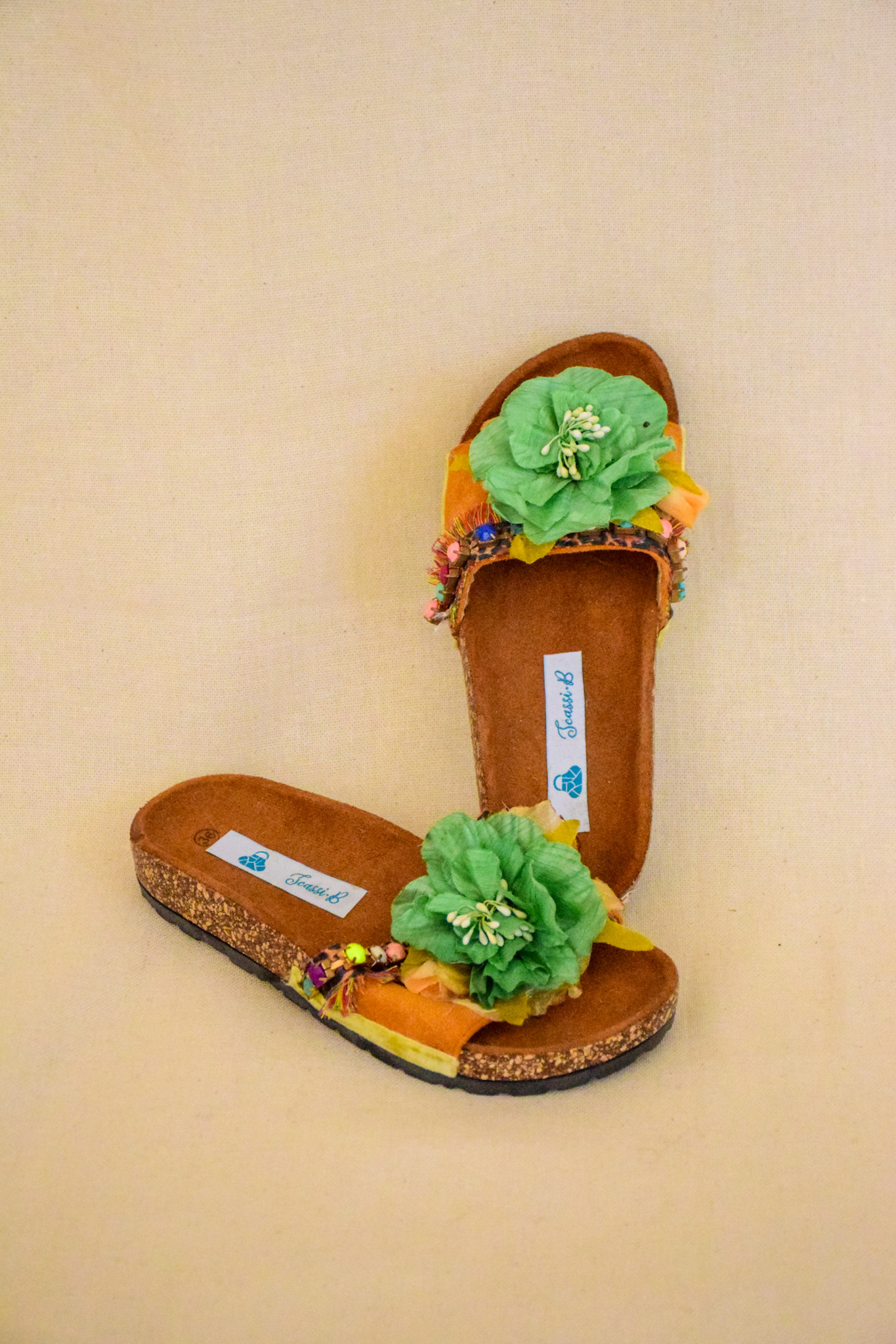 Sandalia, planta corcho,eco gamuza, aplicacion flor.Mide 23cms.