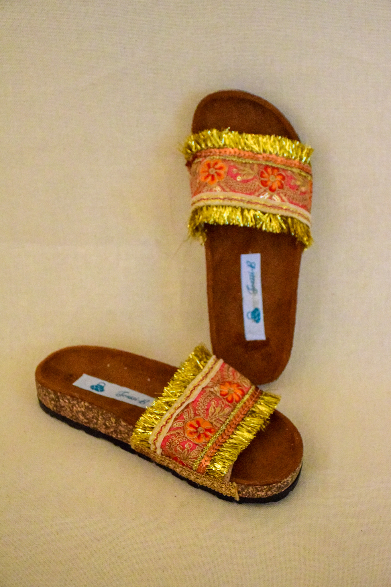 Sandalia, base corcho, decorada con bordados , flecos dorados.Mide 24 cms.