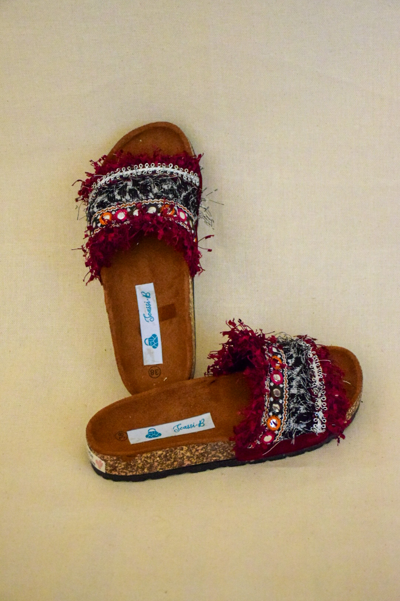 Sandalias , base corcho,print, flecos.Mide 24,5 cms.