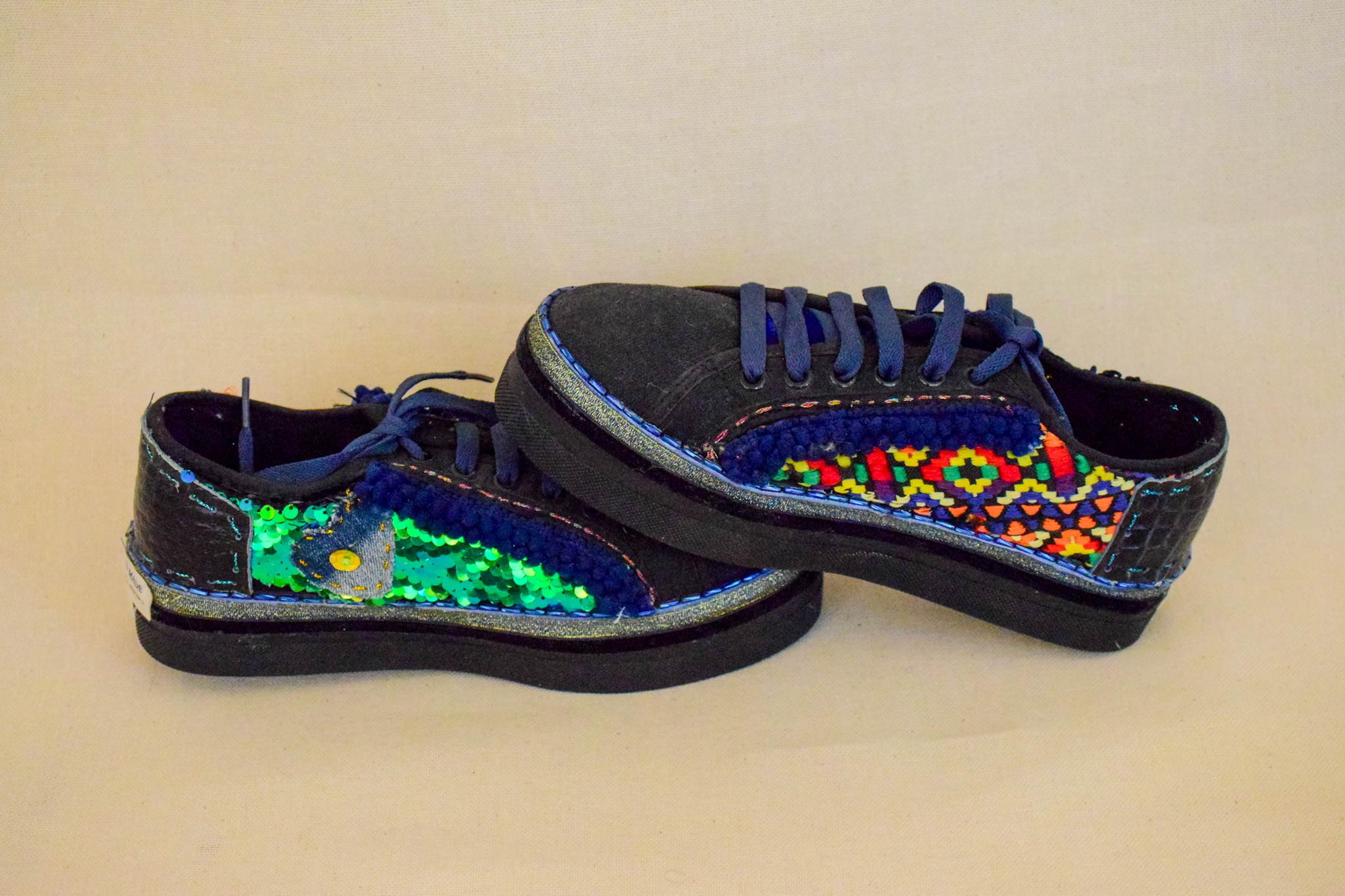 Zapatilla lona negra, impermeabilizada, lentejuelas,aplicacion cuero.Mide 24,5 cms