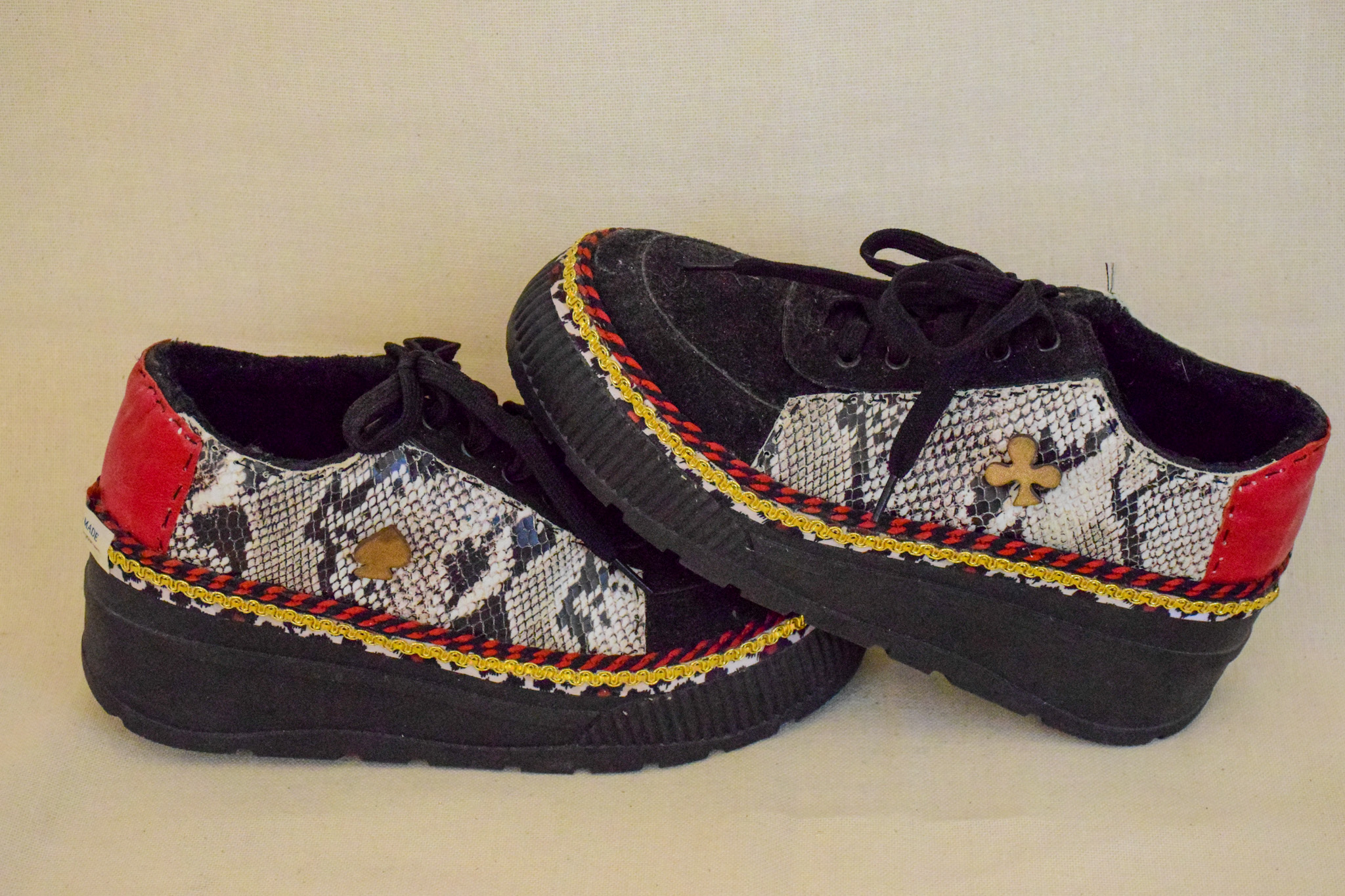 Zapatilla eco cuero,aplicacion cuero serpiente y rojo.Tacon 7cms. Mide 28 cms.