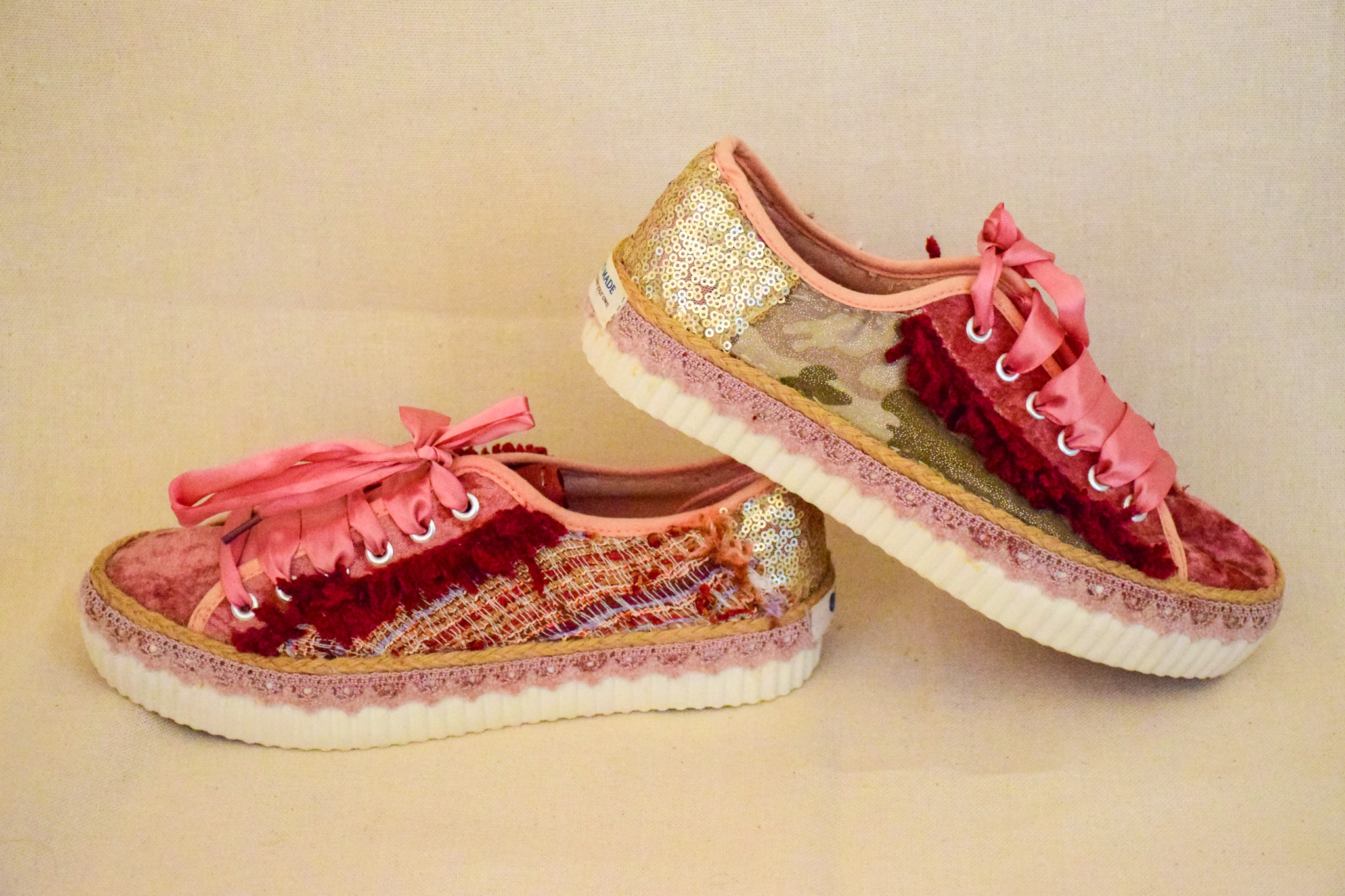Za.patilla eco gamuza, rosada,aplicacion lentejuelas doradas.Mide 26,5 cms