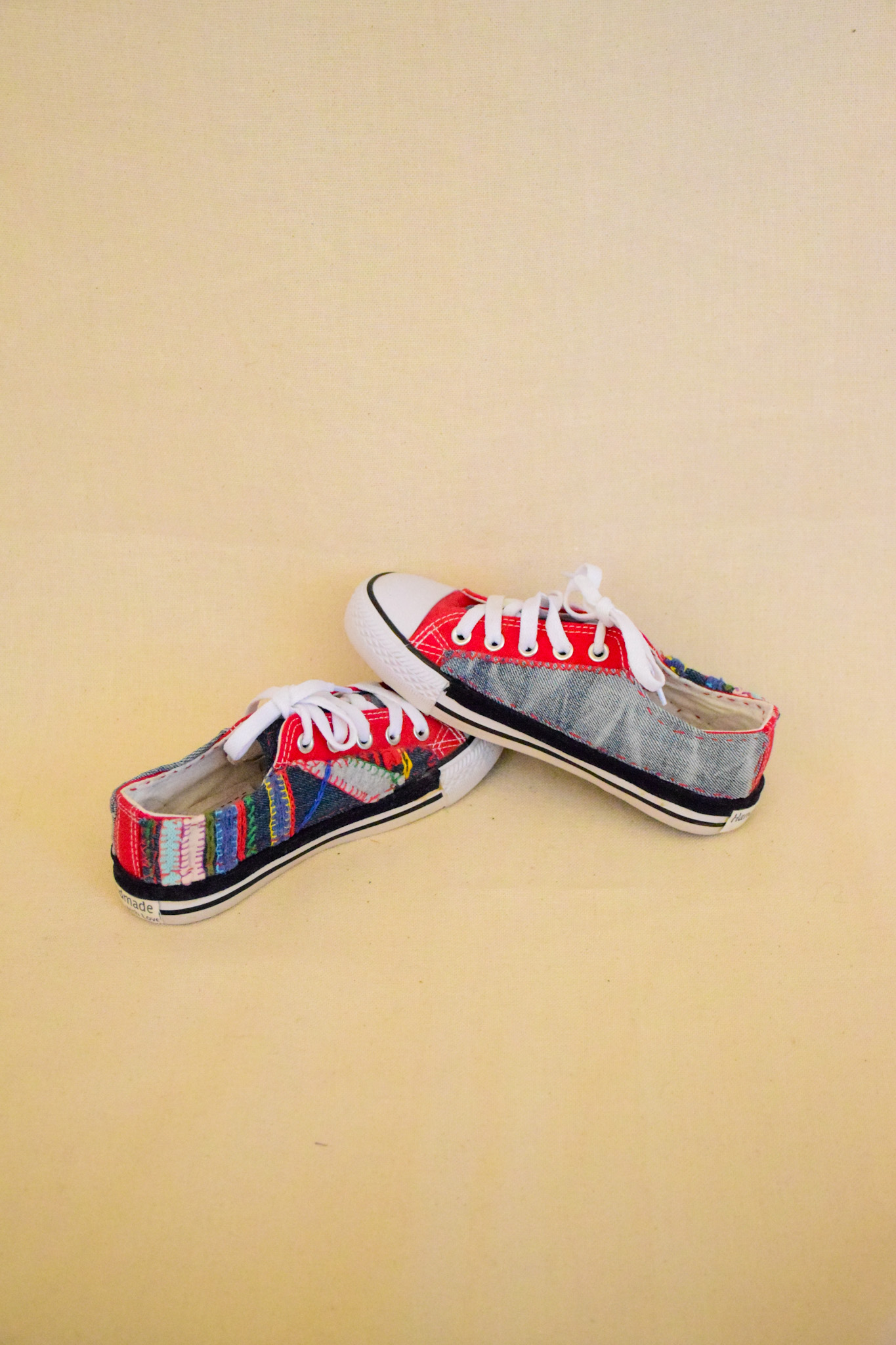 Zapatilla, infantil, unisex,aplicaciones jeans, bordada a mano, lona, roja, impermeabilizada.Mide 22 cms.